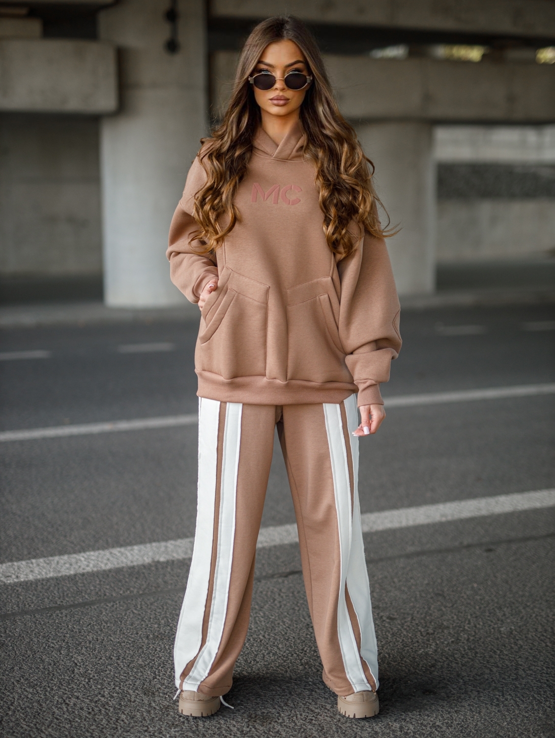 Bluza Damska DOUBLE – krótka, z kapturem. Oryginalny wzór bluzy – krój oversize z podwójnymi kieszeniami i znaczkiem MC.