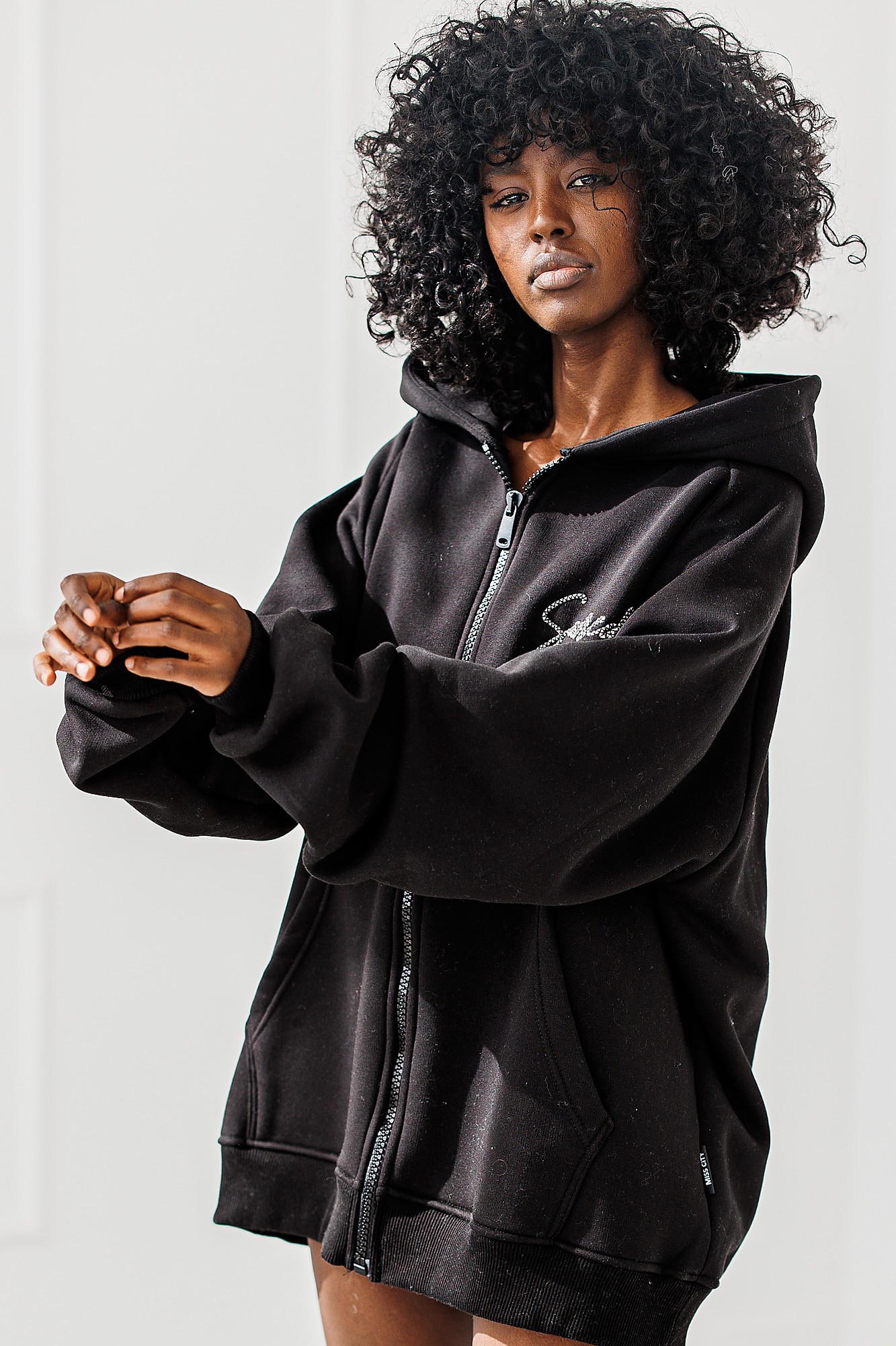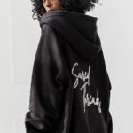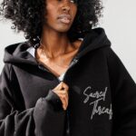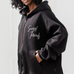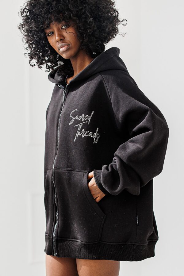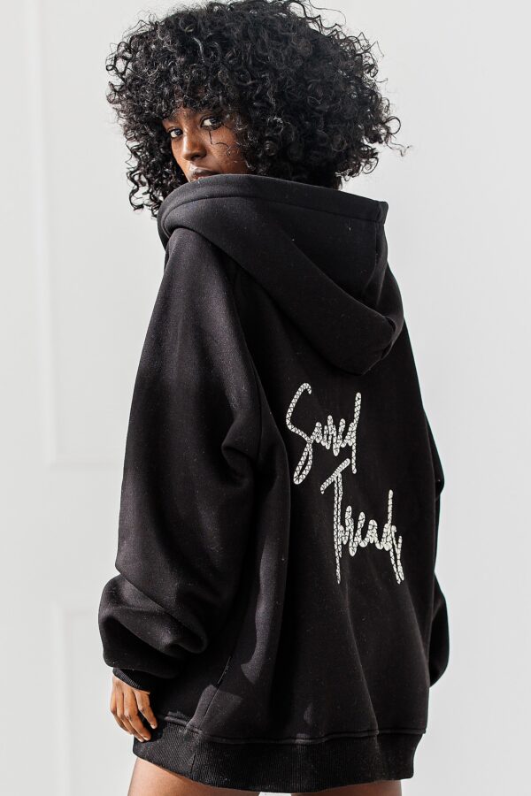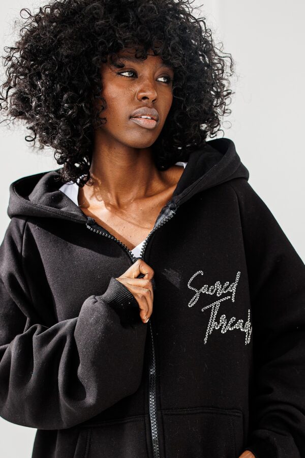 Czarna Bluza Chill Mode to rozpinany model bluzy z kapturem, ozdobiona stylowym napisem z przodu i na plecach. Idealna dla osób, które cenią modę z duszą – prostą, ale z pazurem.