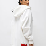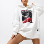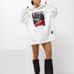 Długa bluza z kapturem o wygodnym, lekko oversize’owym kroju. Wykonana z miękkiej dzianiny, sięga do połowy uda i świetnie sprawdza się na chłodniejsze dni. Z przodu znajduje się wyraźny nadruk, który dodaje jej charakteru. Duży, obszerny kaptur zapewnia komfort i tworzy sportowy look, a z tyłu umieszczona jest kontrastowa metka, stanowiąca efektowny detal wyróżniający całą stylizację. Idealna do codziennych, casualowych zestawów.