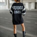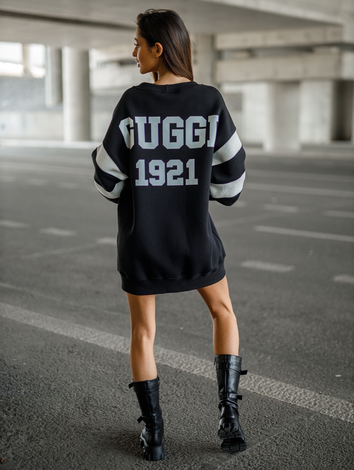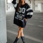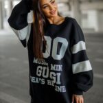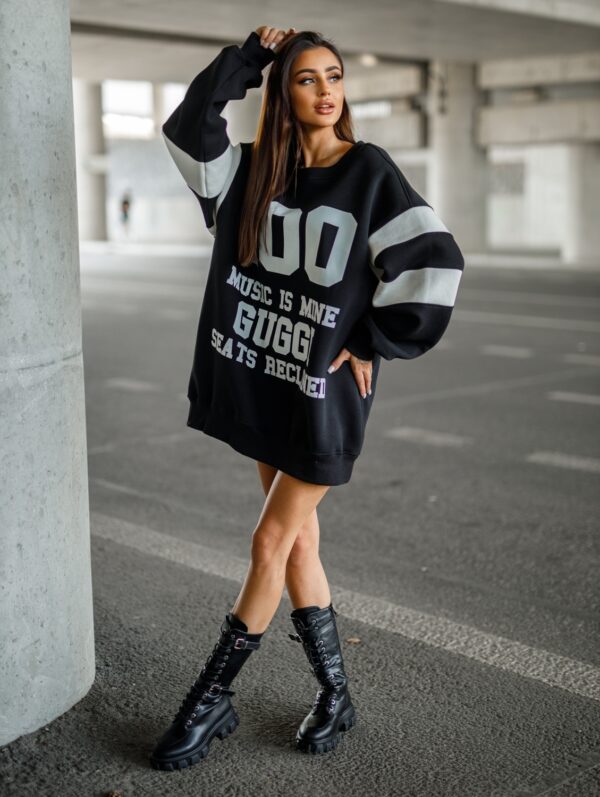 Duża, oversize bluza damska wkładana przez głowę, bez kaptura. Aplikacje z przodu i z tyłu. Na rękawach 2 pasy.