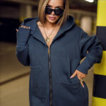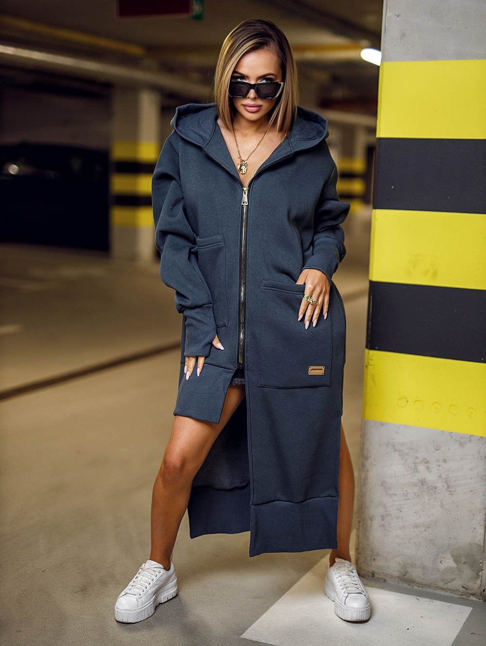 Bluza damska, długa , asymetrycznie zakończona. Bluza z kapturem. Posiada kieszenie oraz złotą blaszkę. Ściągacz przy rękawach.