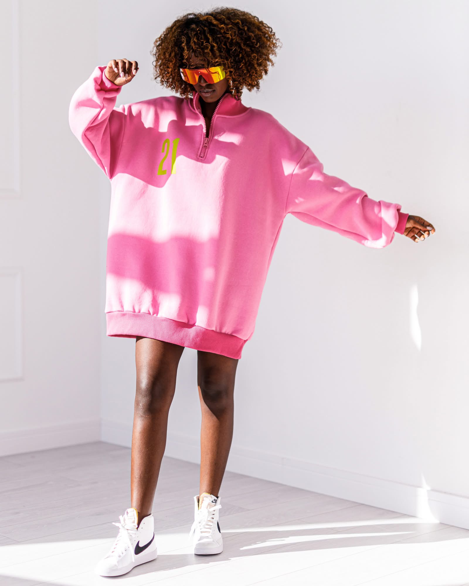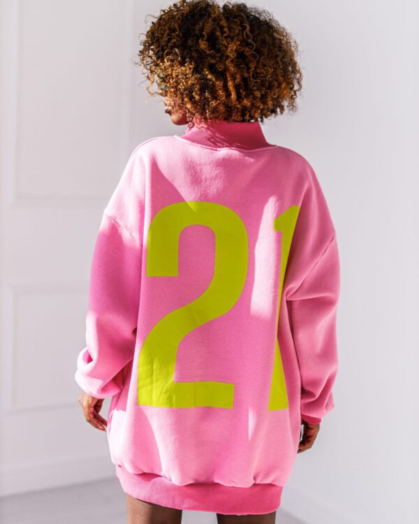 Modna bluza oversize w kolorze różowym z kontrastowymi ściągaczami i efektownym nadrukiem „21” na plecach. Luźny krój zapewnia wygodę, a sportowo-streetwearowy styl sprawdzi się w codziennych stylizacjach.