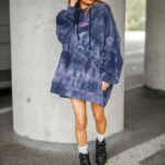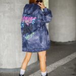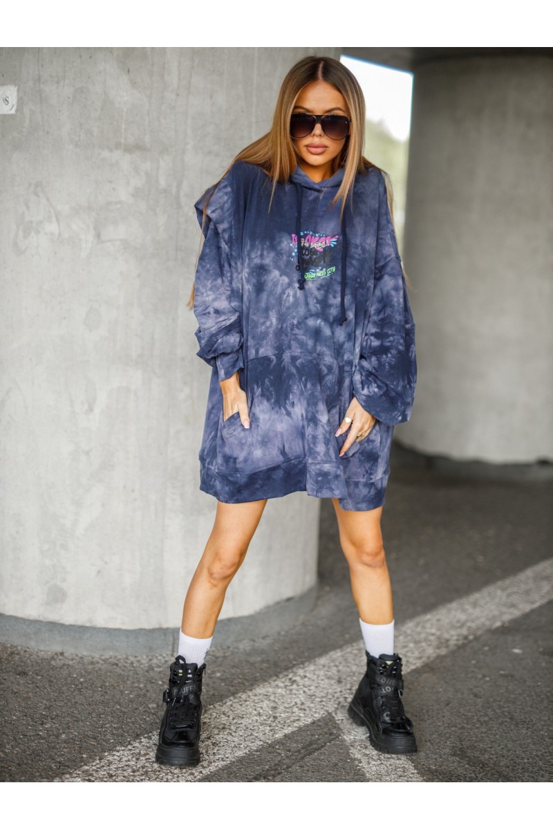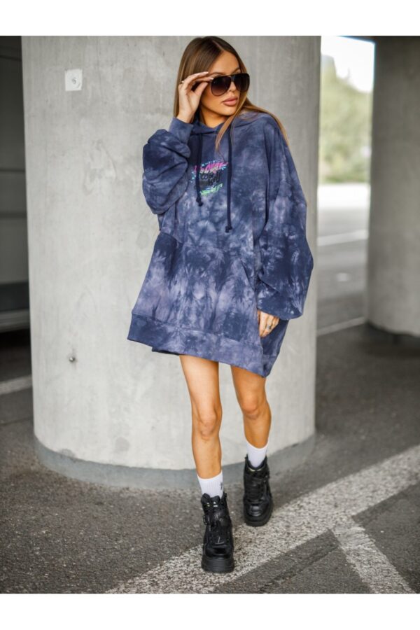 Duża, oversize bluza damska wkładana przez głowę, z kapturem, wykonana z dekatyzowanego materiału. Aplikacja z przodu i z tyłu.