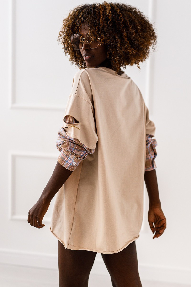 Bluzka połączona z koszulowymi rękawami. Model, który urozmaici każdy outfit.