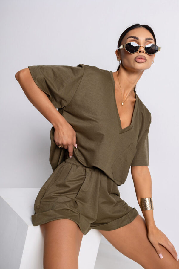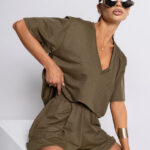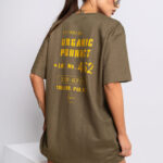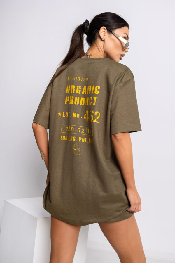 Stylowa bluzka z dekoltem w serek, wykonana z lekkiego materiału przypominającego len, który zapewnia komfort i naturalny wygląd. Luźny fason gwarantuje swobodę noszenia, a militarne nadruki z nazwą marki nadają całości wyrazistego charakteru.