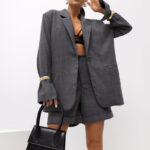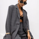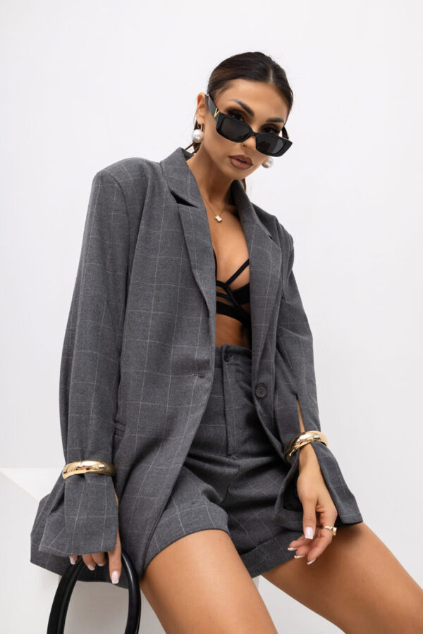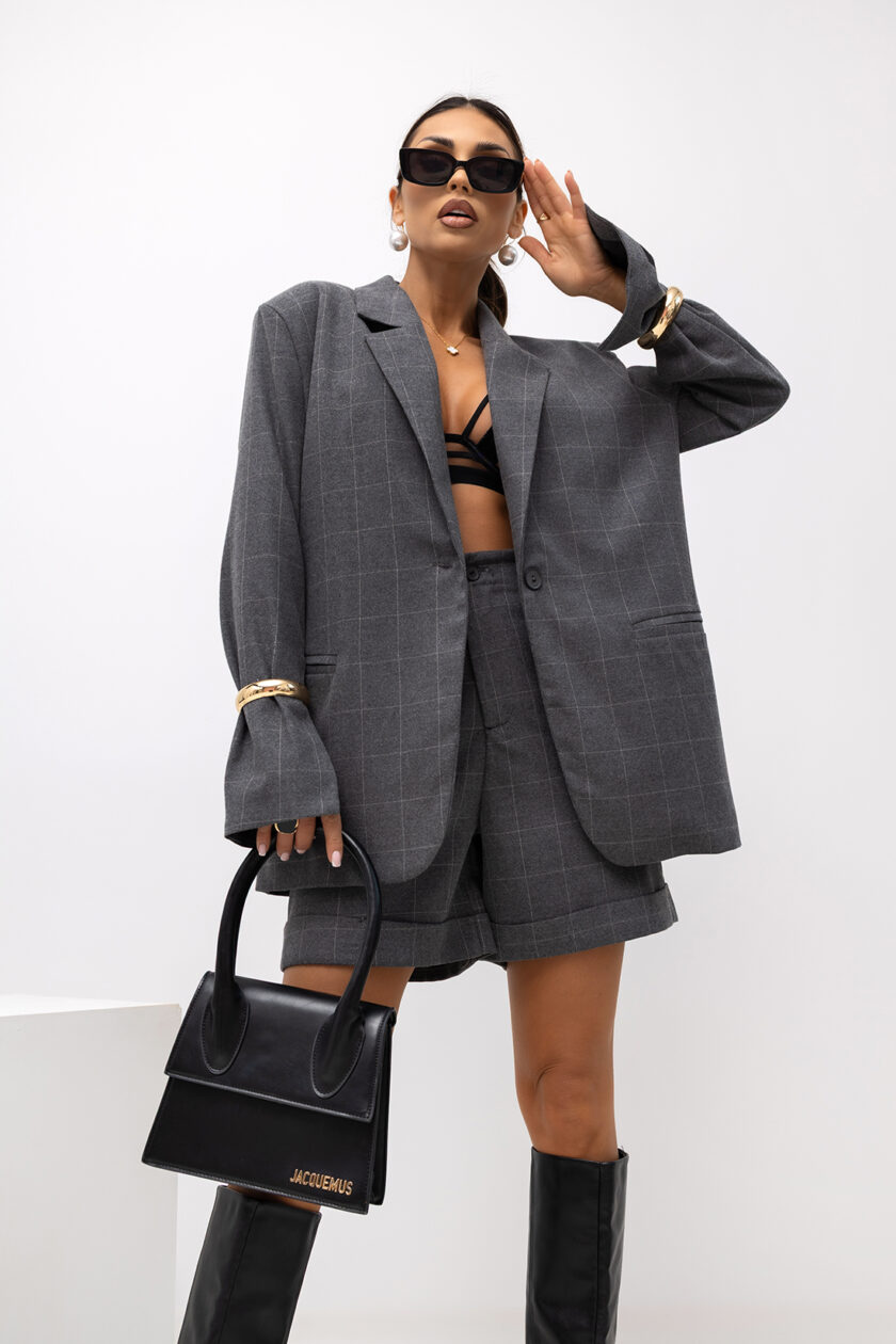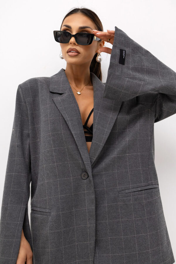 Oversize’owa marynarka o klasycznym kroju, wykonana z tkaniny w subtelną kratę. Model z szerokimi klapami i prostą linią ramion, który łączy elegancję z nowoczesnym, modowym charakterem. Uniwersalny odcień szarości sprawia, że marynarka doskonale sprawdzi się zarówno w formalnych, jak i casualowych stylizacjach.