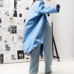 Stylowy płaszcz wykonany z wysokiej jakości materiału, ma luźny, oversize’owy krój, zapewniając swobodę ruchów. Szerokie ramiona i podwójne zapięcie na guziki nadają wyrazistej formy, a duże kieszenie oraz naszywka na rękawie dodają oryginalności i charakteru. Rękawy można wywinąć na 3/4, by odsłonić pięknie obszytą podszewkę, co dodaje eleganckiego akcentu.