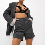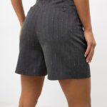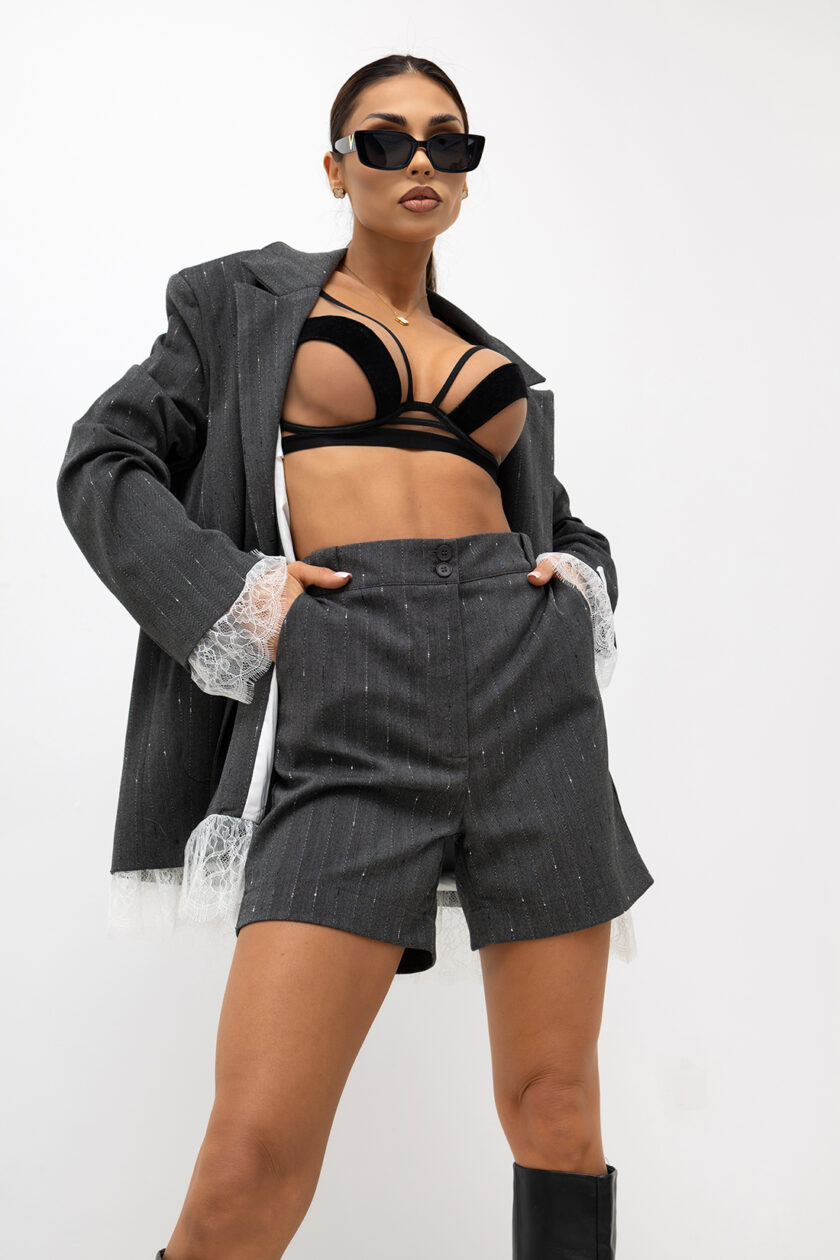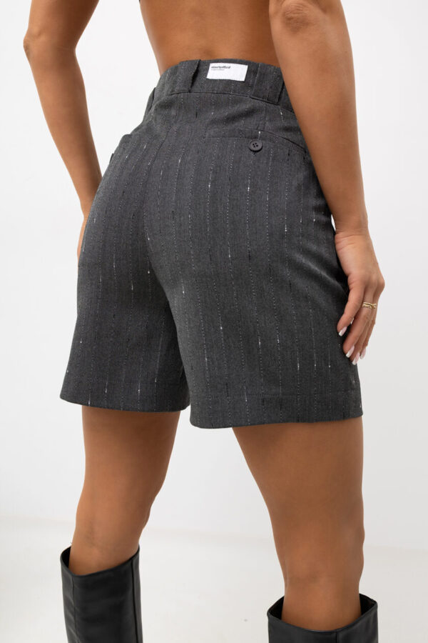 Szare szorty o wysokim stanie, wykonane z tkaniny z delikatnym dodatkiem złotej nitki. Model o lekko rozszerzanym kroju z zakładkami w pasie, zapinany na guzik i zamek. Klasyczna forma bez dodatkowych zdobień sprawia, że szorty są uniwersalne i doskonale komponują się z marynarką z kompletu oraz innymi elementami garderoby.