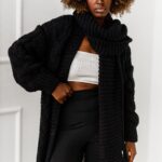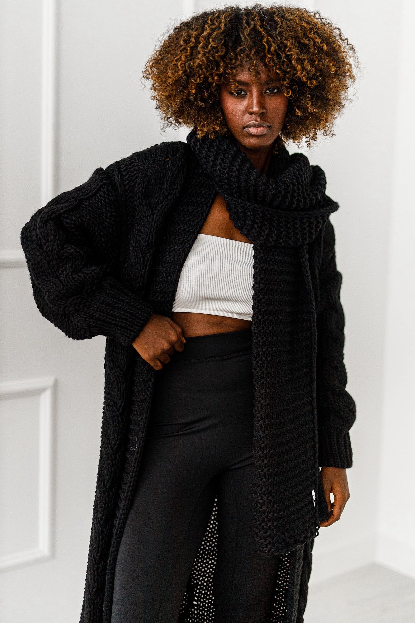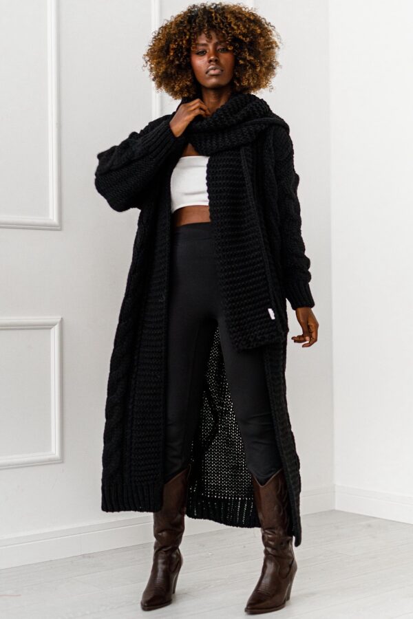 Długi, ciepły kardigan w zestawie z obszernym szalikiem