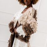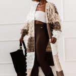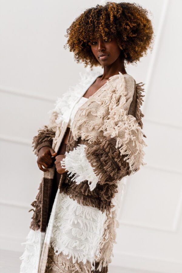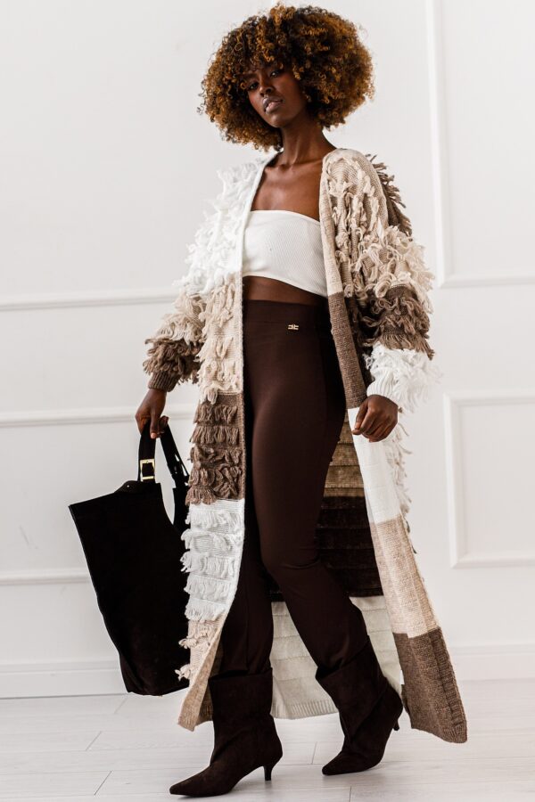 Brązowy z czarnym Kardigan Boho Dream to uniwersalny fason pasujący do wielu stylizacji. Wykonany z miękkiej dzianiny i efektownych frędzli. Dłuższy