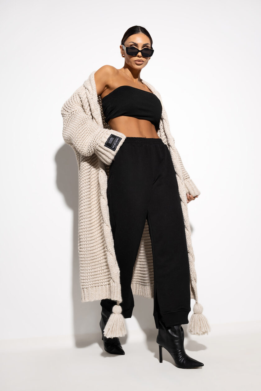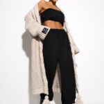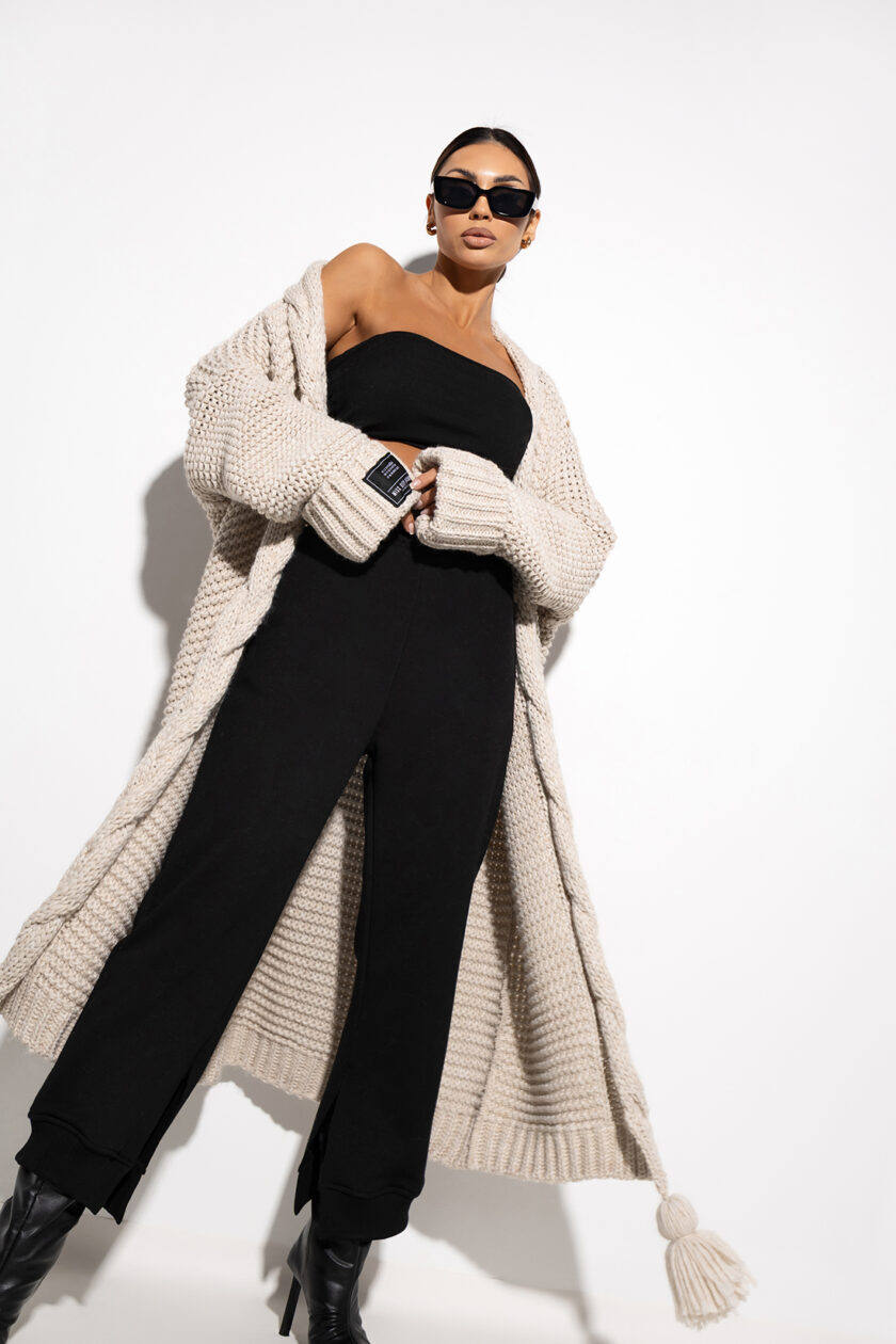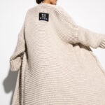 To długi, gruby sweter sięgający do kostek, niezwykle ciepły i miękki w dotyku. Nie posiada żadnego zapięcia, dzięki czemu układa się swobodnie i otula sylwetkę jak przytulny płaszcz. U dołu wykończony jest gęstymi frędzlami, które nadają mu lekko boho charakter. Na plecach znajduje się dyskretna naszywka marki, dodająca całości stylowego, dopracowanego akcentu.