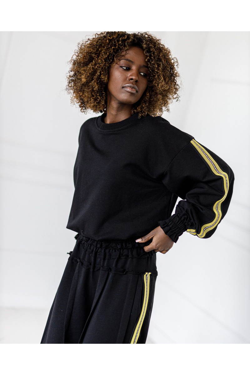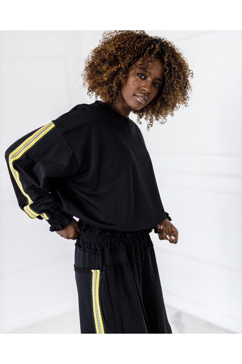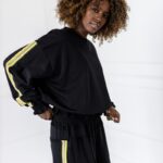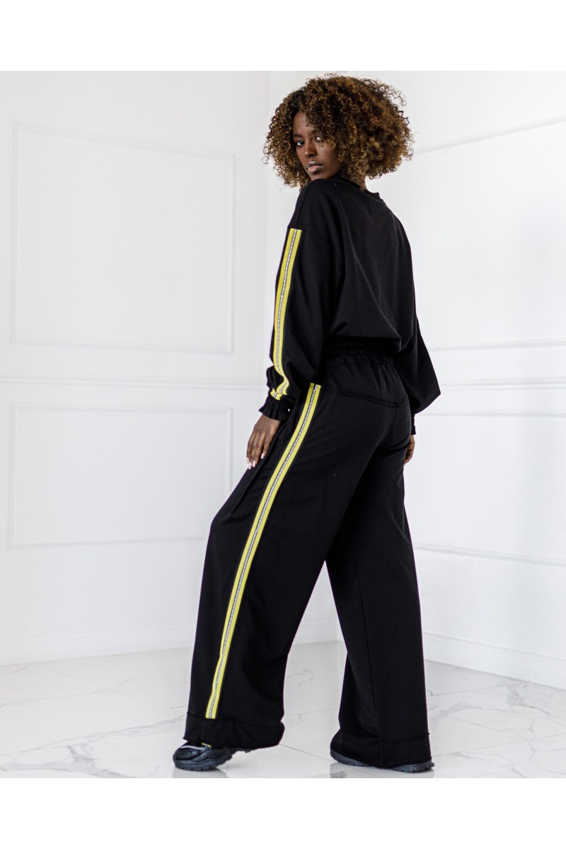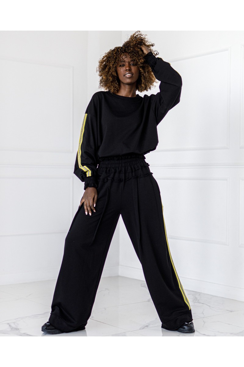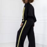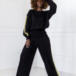 Stylowy komplet składający się z bluzy zakładanej przez głowę z lampasami po bokach oraz spodni z lampasami. Wygodny krój i miękki materiał zapewniają komfort na co dzień, a sportowe detale nadają nowoczesny charakter.