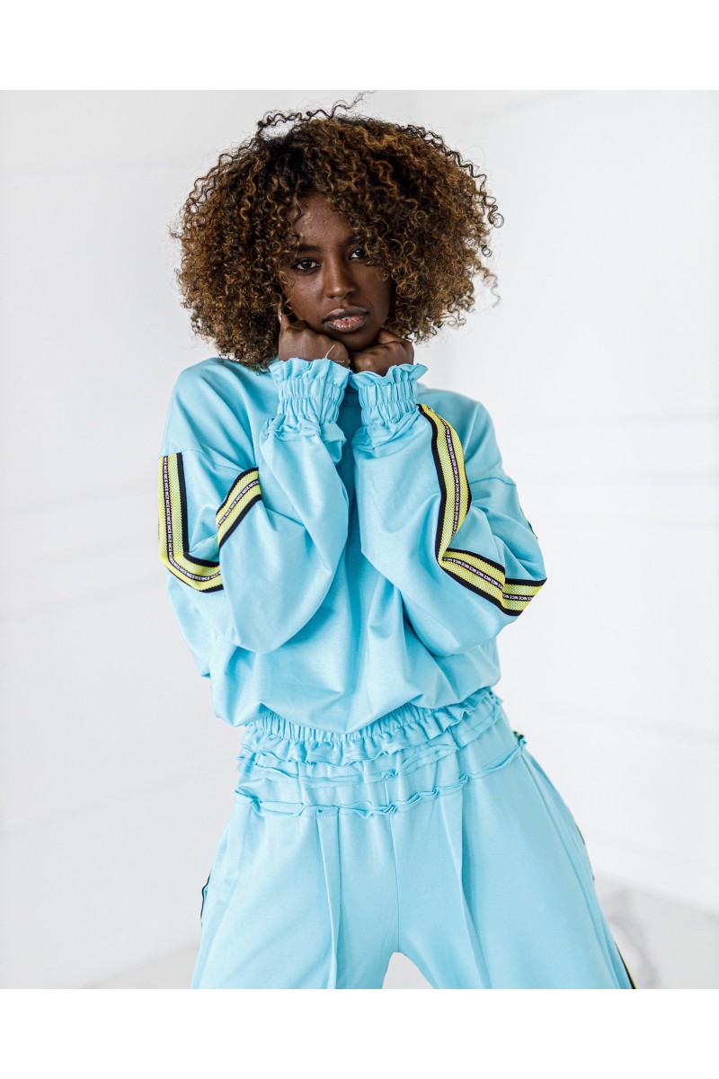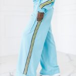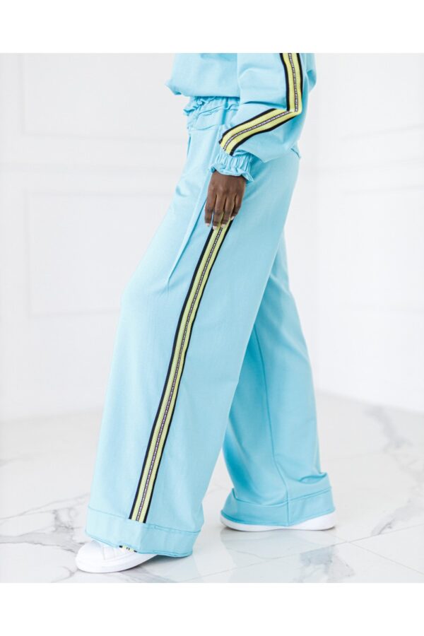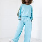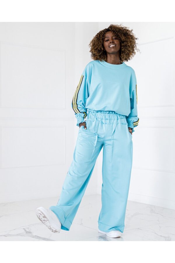 Stylowy komplet składający się z bluzy zakładanej przez głowę z lampasami po bokach oraz spodni z lampasami. Wygodny krój i miękki materiał zapewniają komfort na co dzień, a sportowe detale nadają nowoczesny charakter.