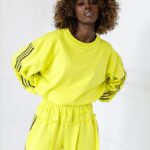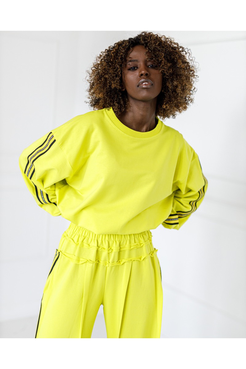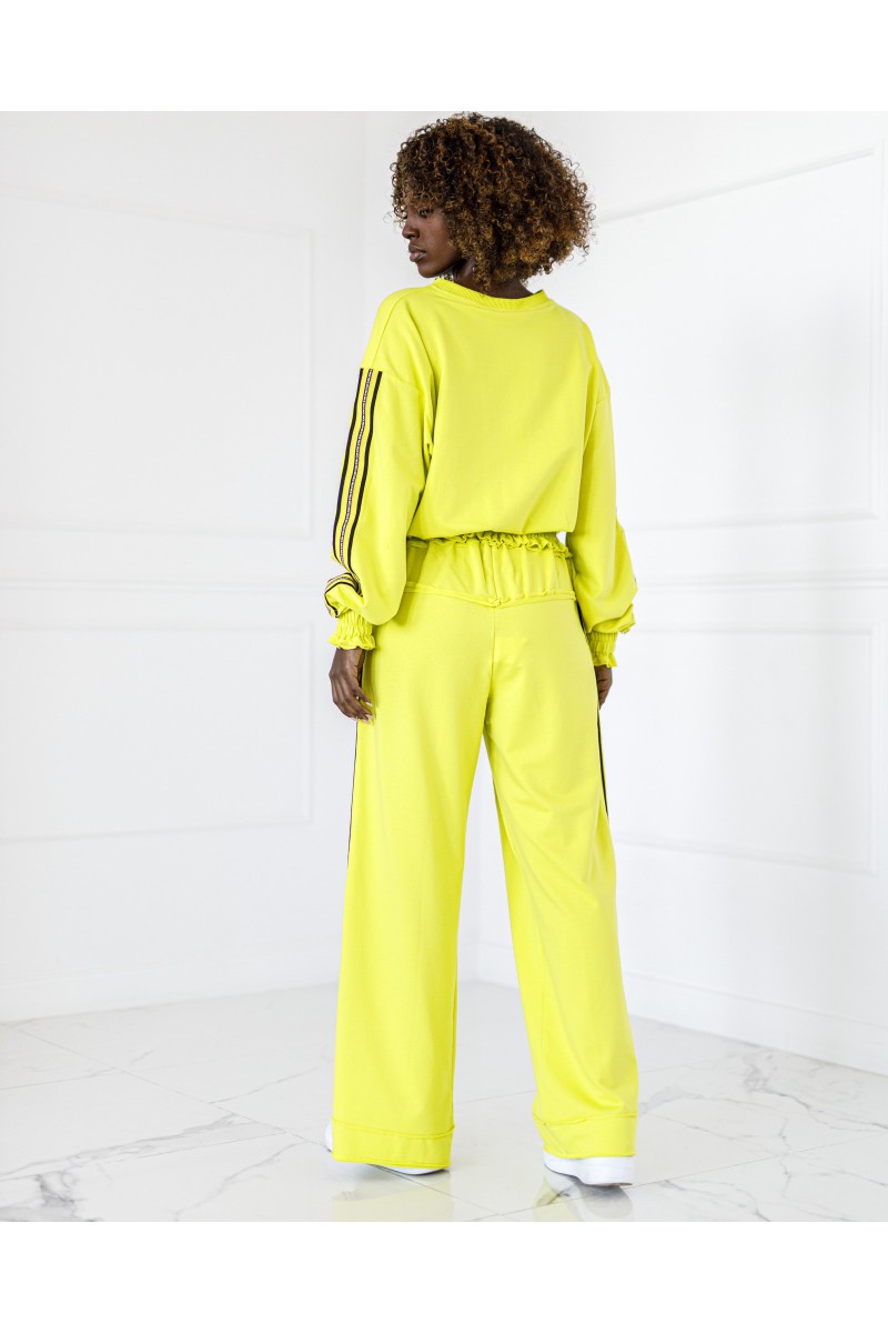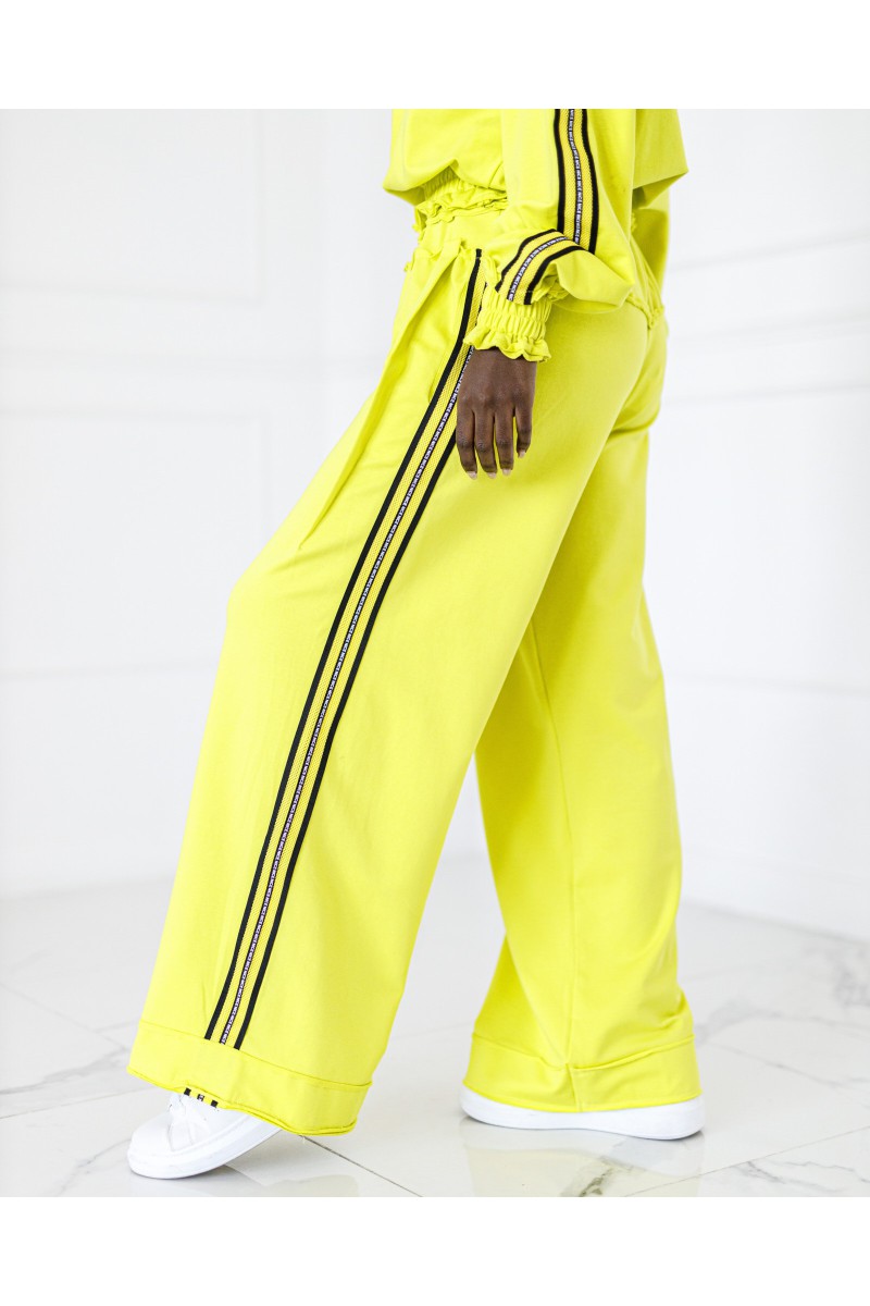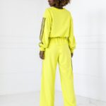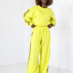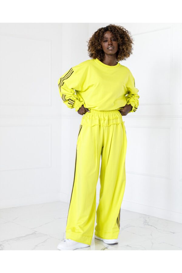 Stylowy komplet składający się z bluzy zakładanej przez głowę z lampasami po bokach oraz spodni z lampasami. Wygodny krój i miękki materiał zapewniają komfort na co dzień, a sportowe detale nadają nowoczesny charakter.
