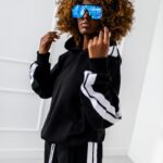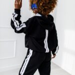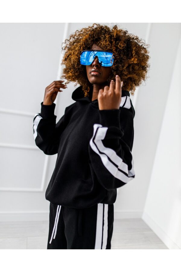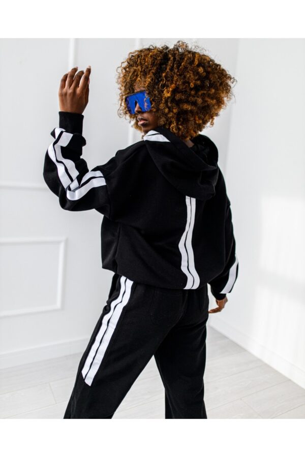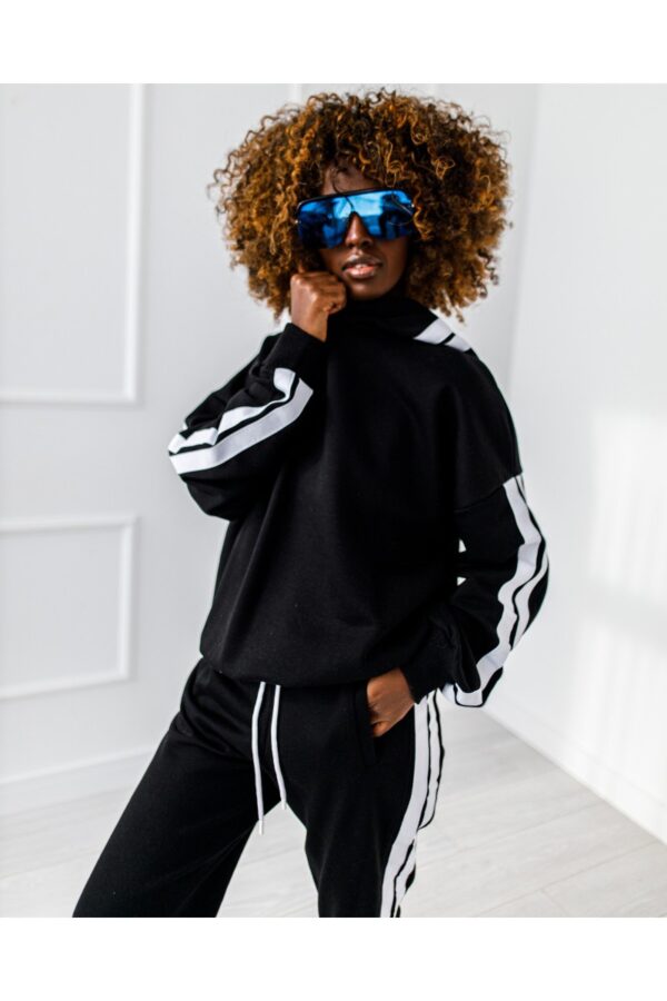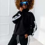 Stylowy komplet damski, który łączy sportową wygodę z nowoczesnym designem. Zestaw składa się z bluzy z taśmami oraz spodni z elastyczną talią, tworząc spójną i bardzo modną całość.