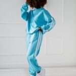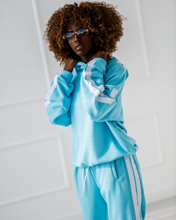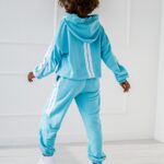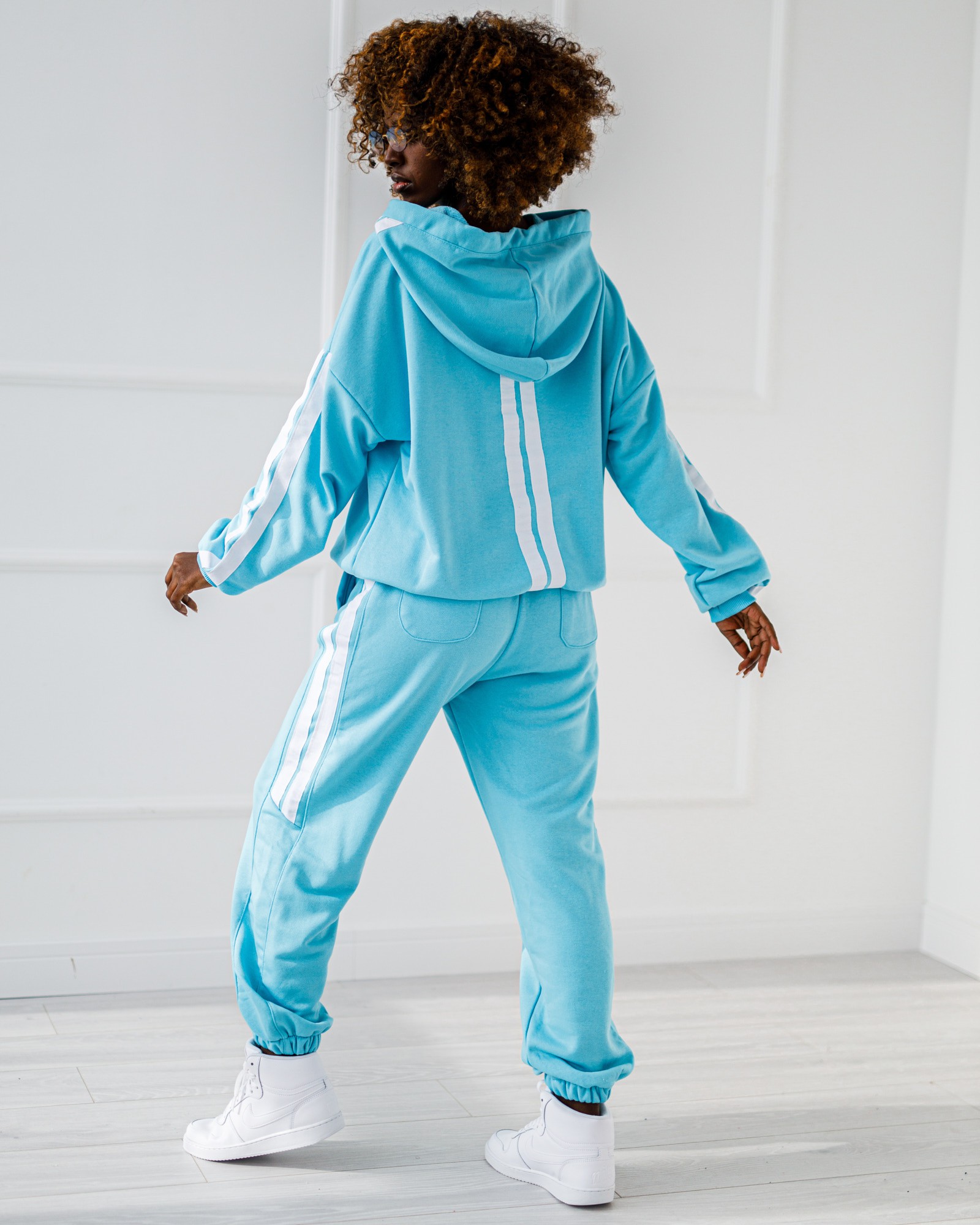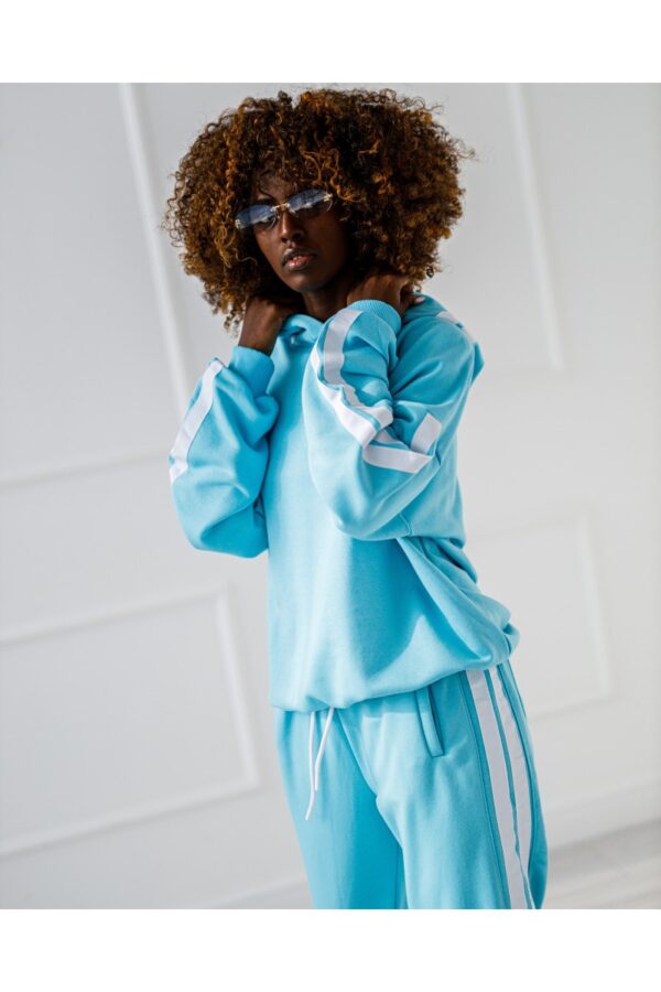 Stylowy komplet damski, który łączy sportową wygodę z nowoczesnym designem. Zestaw składa się z bluzy z taśmami oraz spodni z elastyczną talią, tworząc spójną i bardzo modną całość.