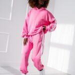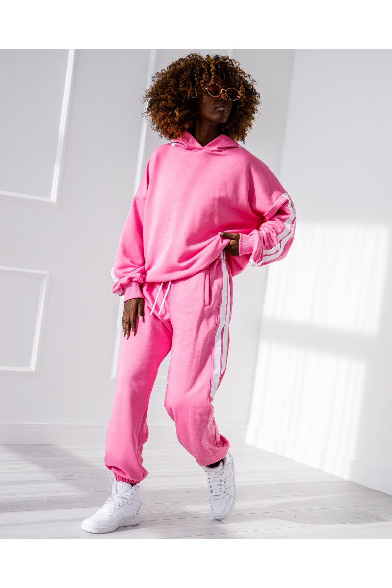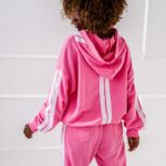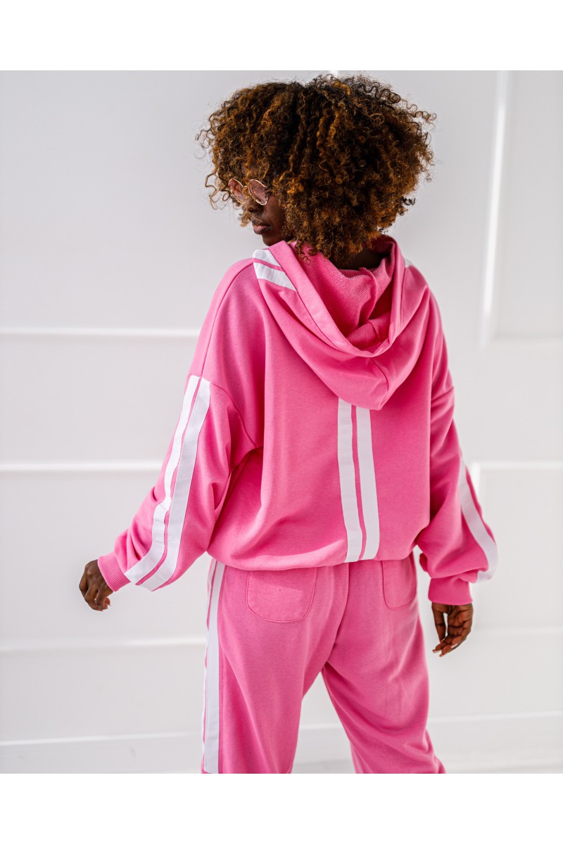 Stylowy komplet damski, który łączy sportową wygodę z nowoczesnym designem. Zestaw składa się z bluzy z taśmami oraz spodni z elastyczną talią, tworząc spójną i bardzo modną całość.