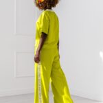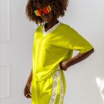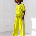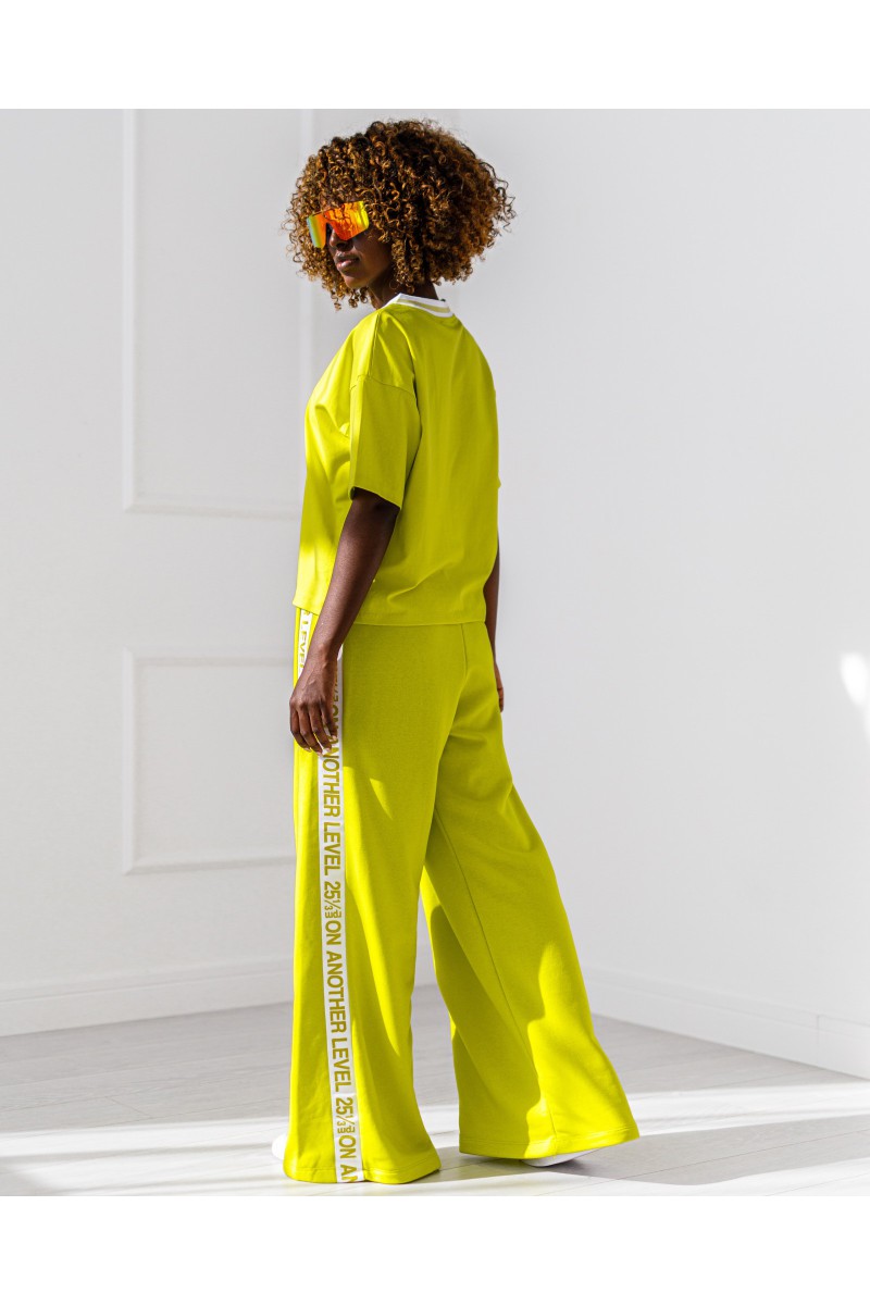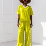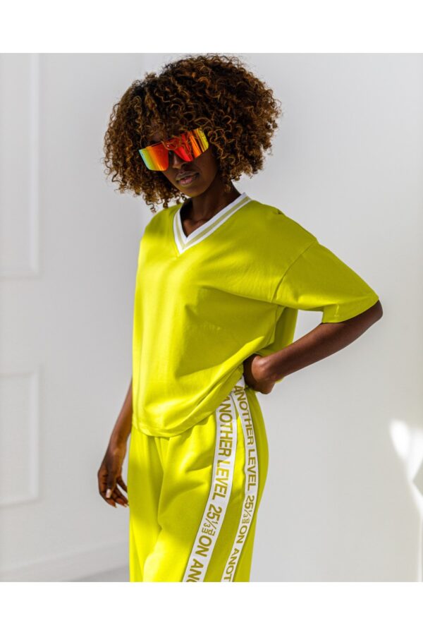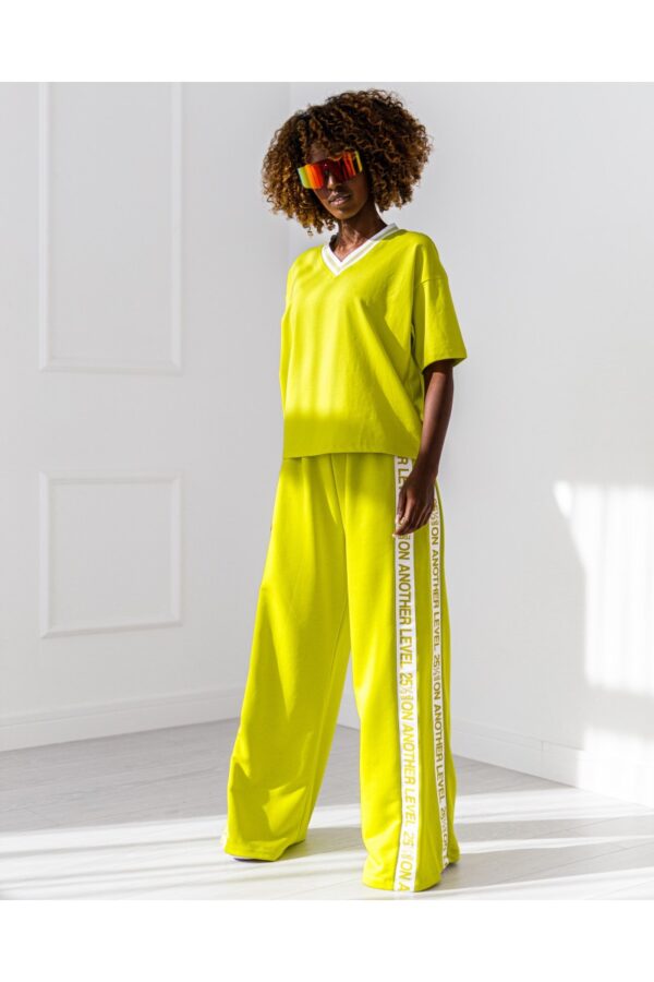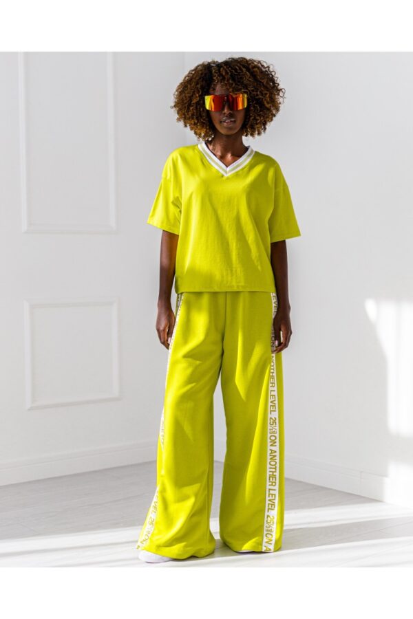 Komplet dresowy z dekoltem w serek. Szerokie spodnie z lampasami.