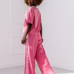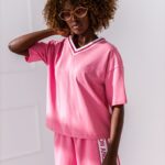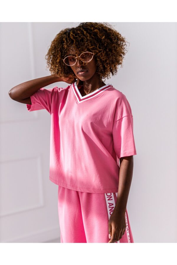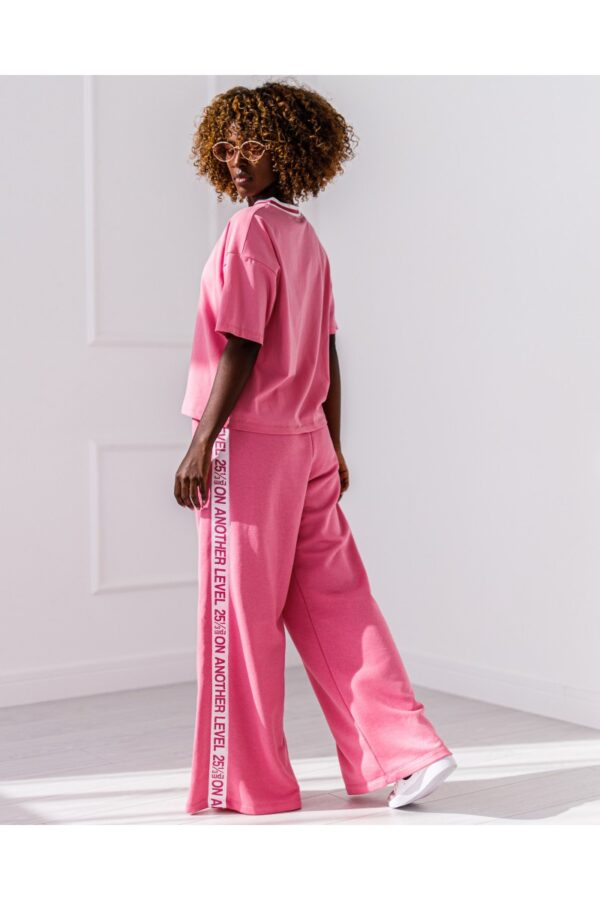 Komplet dresowy z dekoltem w serek. Szerokie spodnie z lampasami.