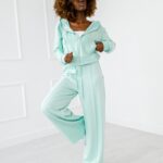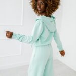 Komplet dresowy, wykonany z przyjemnej w dotyku dzianiny. Składający się z dwóch elementów , szerszych spodni i rozpinanej bluzy z kapturem.