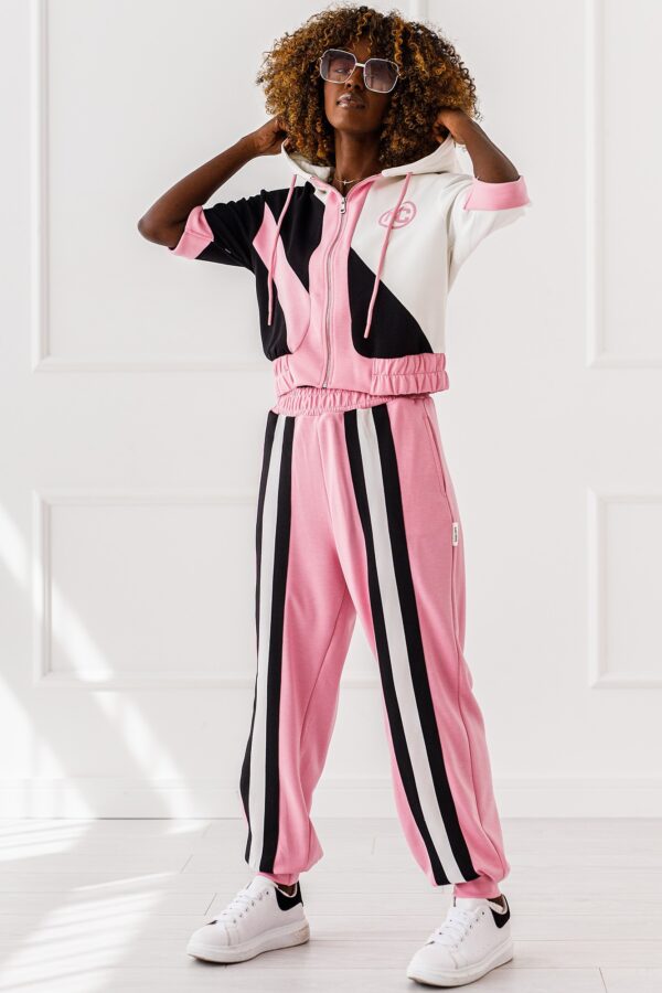 Komplet dresowy niezwykle miły w dotyku. Spodnie posiadają gumę w pasie oraz kieszenie. Bluza z krótkim rękawem i kapturem.