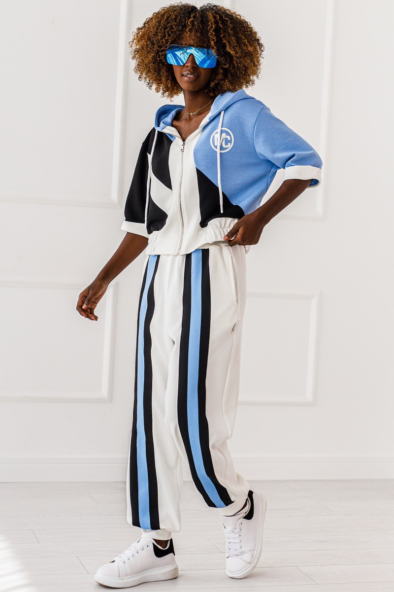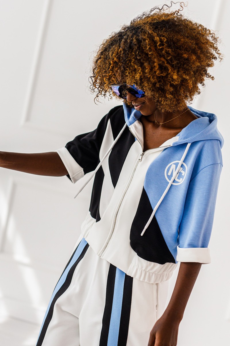 Komplet dresowy niezwykle miły w dotyku. Spodnie posiadają gumę w pasie oraz kieszenie. Bluza z krótkim rękawem i kapturem.