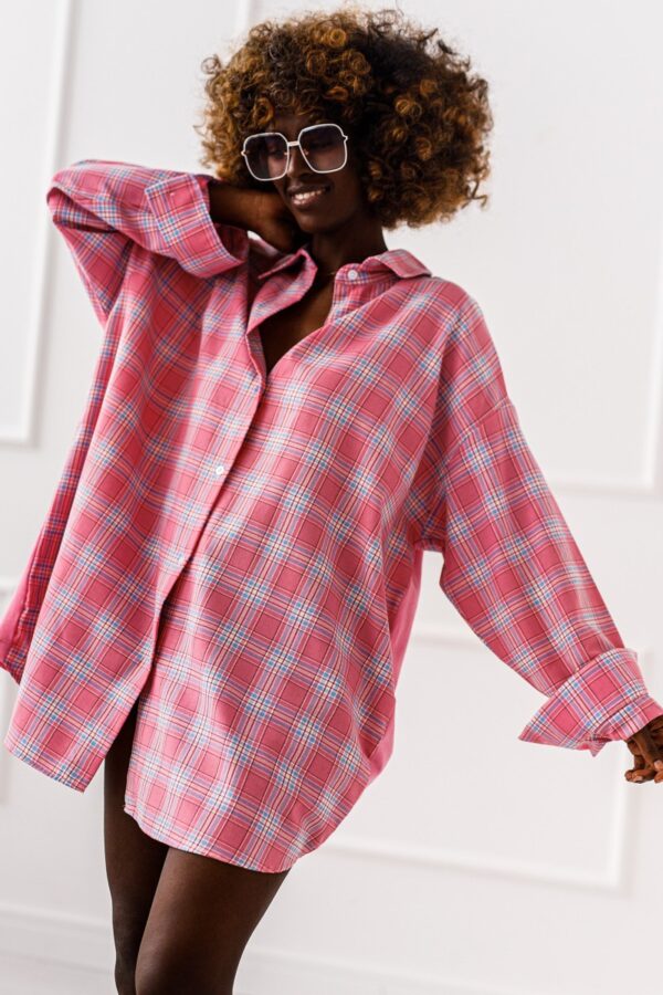 Stylowa koszula damska, łącząca klasyczną kratkę z nowoczesnym akcentem. Przód modelu wykonany jest z modnego wzoru w kratę, natomiast tył pozostaje gładki, jednokolorowy, ozdobiony napisem, co nadaje całości lekkości i oryginalnego charakteru.