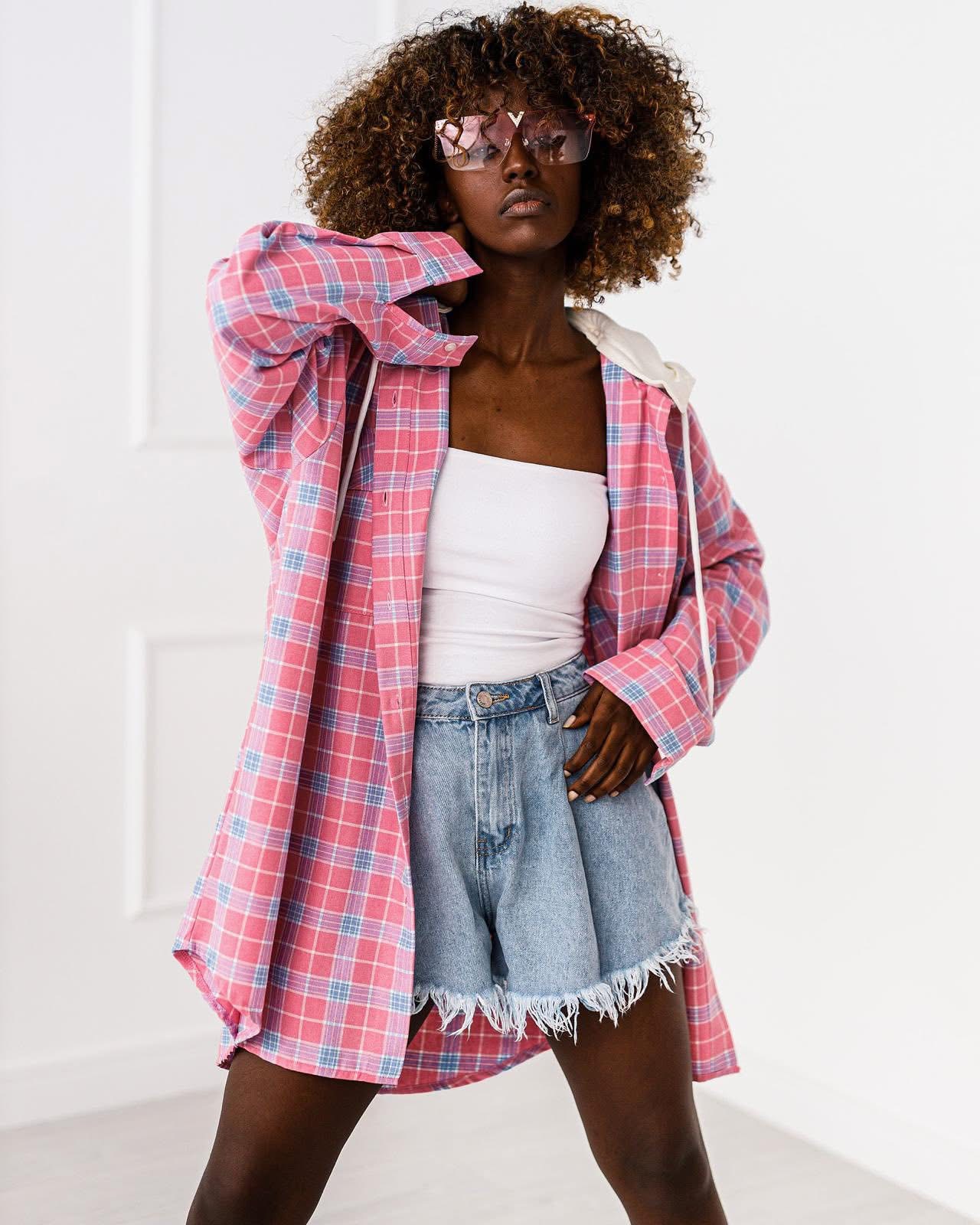 Stylowa koszula w modną kratę, wykonana z wysokiej jakości materiału, zapewniającego komfort noszenia. Model wyróżnia się rozpinanym kapturem z tyłu, który nadaje całości nowoczesny i oryginalny charakter.