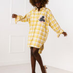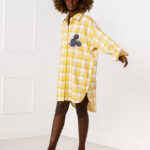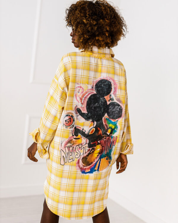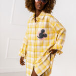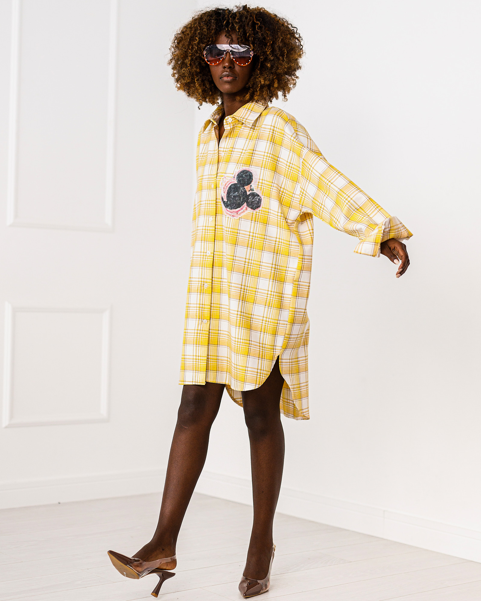Stylowa koszula damska w żółtą kratkę, która łączy klasyczny wzór z modnym, nowoczesnym akcentem. Przód modelu wykonany jest z wyrazistej żółtej kraty, natomiast tył pozostaje gładki, jednokolorowy, ozdobiony efektowną aplikacją w kształcie muszki Miki, nadającą całości oryginalnego charakteru.