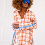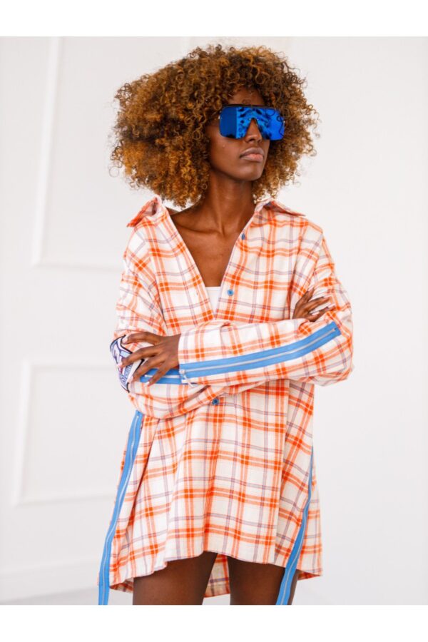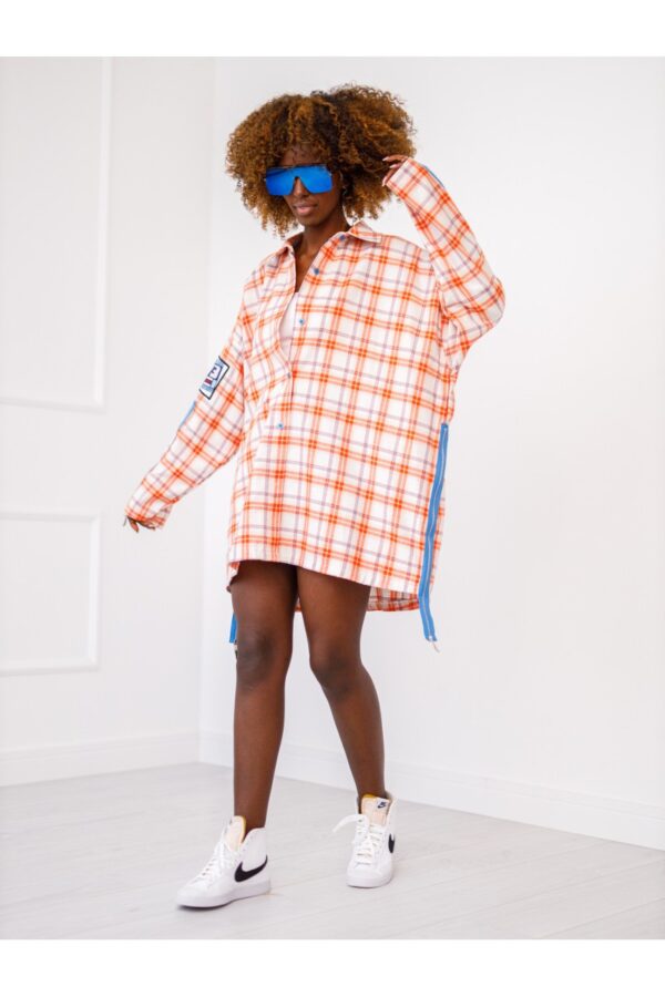 Koszula damska w kratę. Wyróżniają ją suwaki po bokach i na rękawie.
