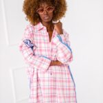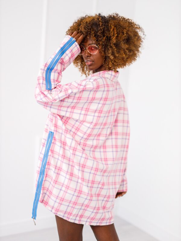 Koszula damska w kratę. Wyróżniają ją suwaki po bokach i na rękawie.
