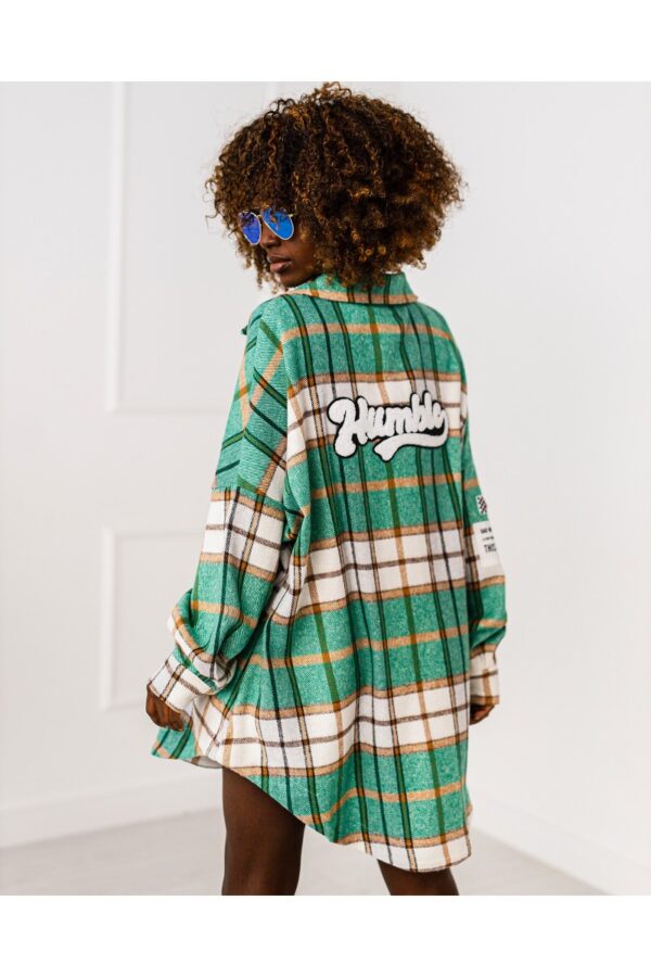 Stylowa koszula damska, łącząca klasyczną kratkę z nowoczesnym akcentem. Przód modelu wykonany jest z modnego wzoru w kratę, natomiast tył pozostaje gładki, jednokolorowy, ozdobiony napisem, co nadaje całości lekkości i oryginalnego charakteru.