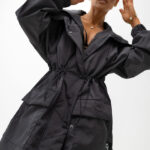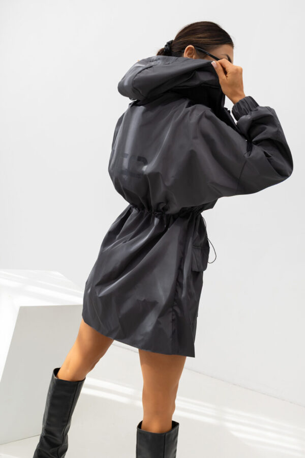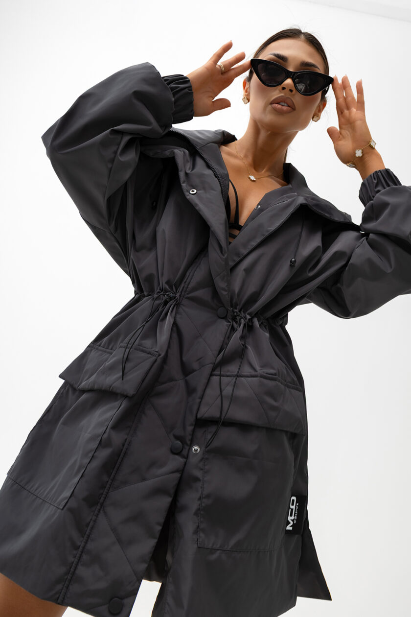 Stylowa kurtka o nowoczesnym, miejskim charakterze i długości do połowy uda. Model zapinany na zamek oraz napy, wyposażony w kaptur ze ściągaczami oraz regulację w talii, która pozwala dopasować fason do sylwetki. Posiada praktyczne kieszenie z przodu i staranne przeszycia, które podkreślają jej modny wygląd.