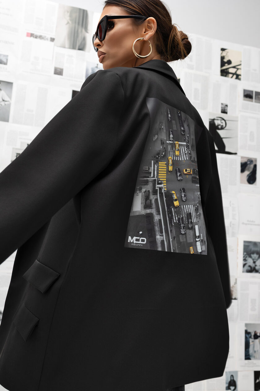 Damska marynarka oversize Crossroads w kolorze czarnym z unikalnym nadrukiem inspirowanym skrzyżowaniami miejskich ulic. Polski producent, wysoka jakość i nowoczesny design. Idealna do stylizacji casual i eleganckich.