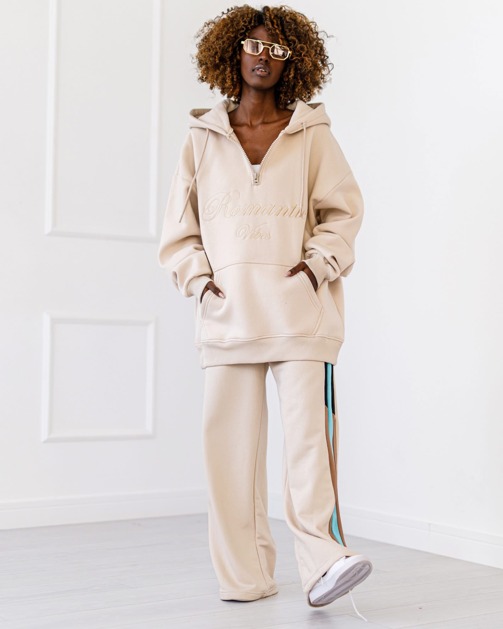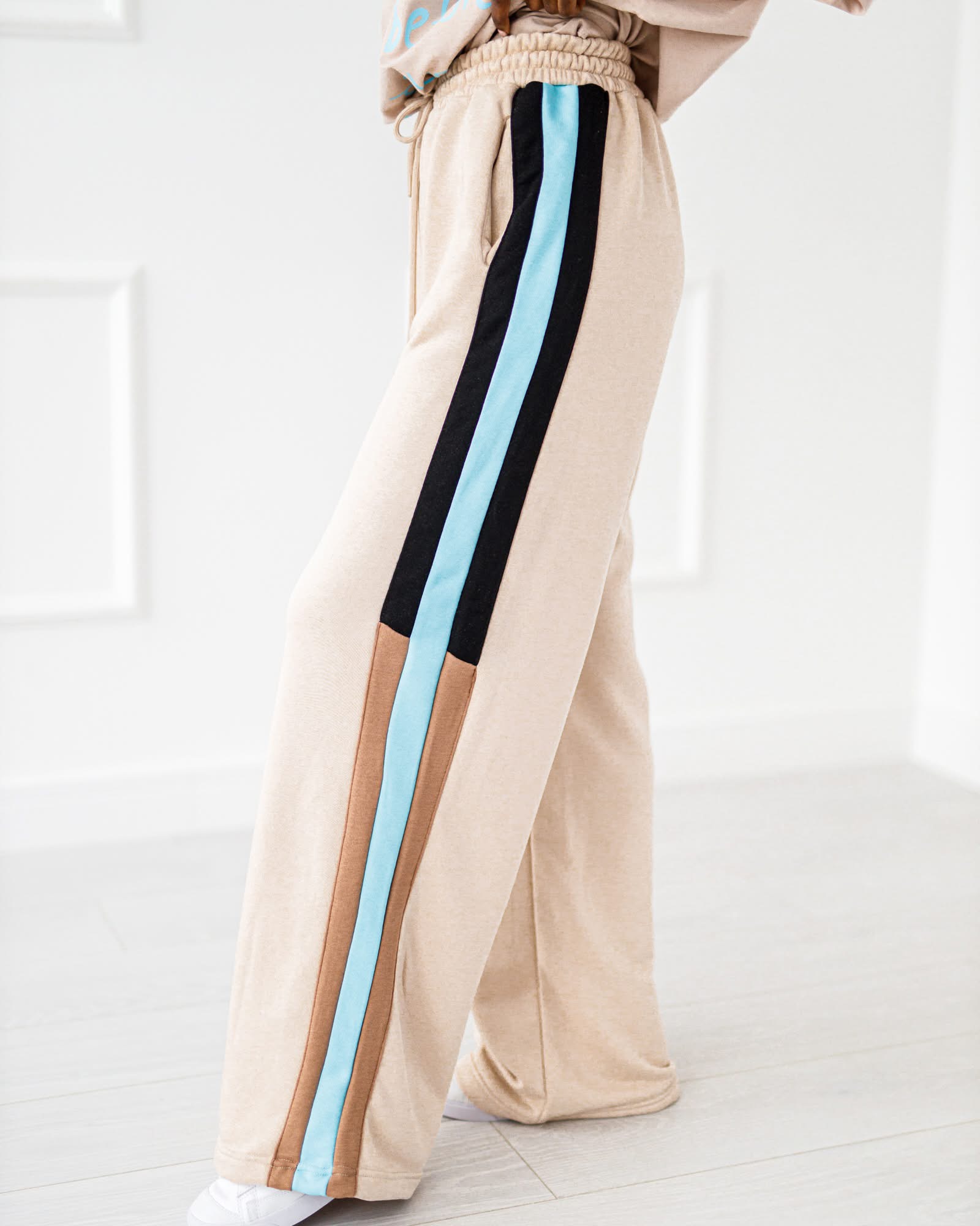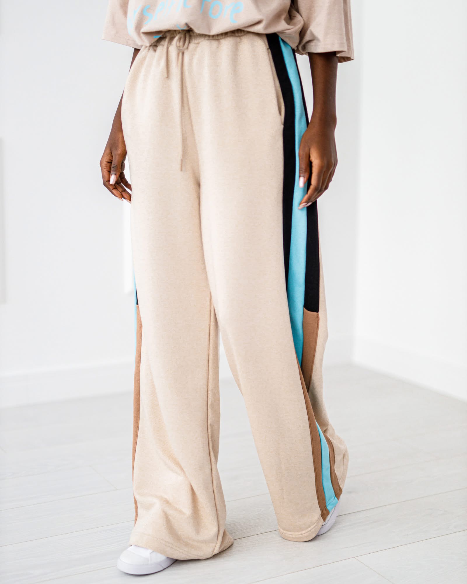 Spodnie luźne dresowe z prostymi nogawkami i paskiem z boku . Idealne na codzienne stylizacje, które łączą wygodę z modnym wyglądem.