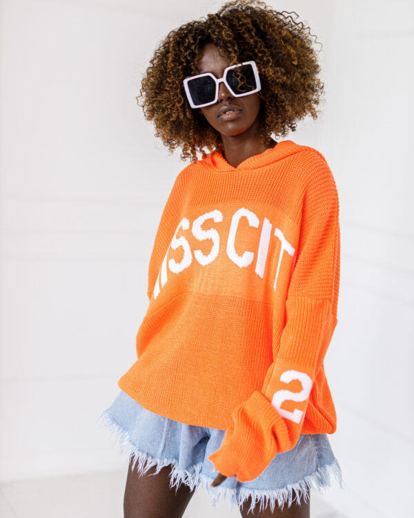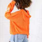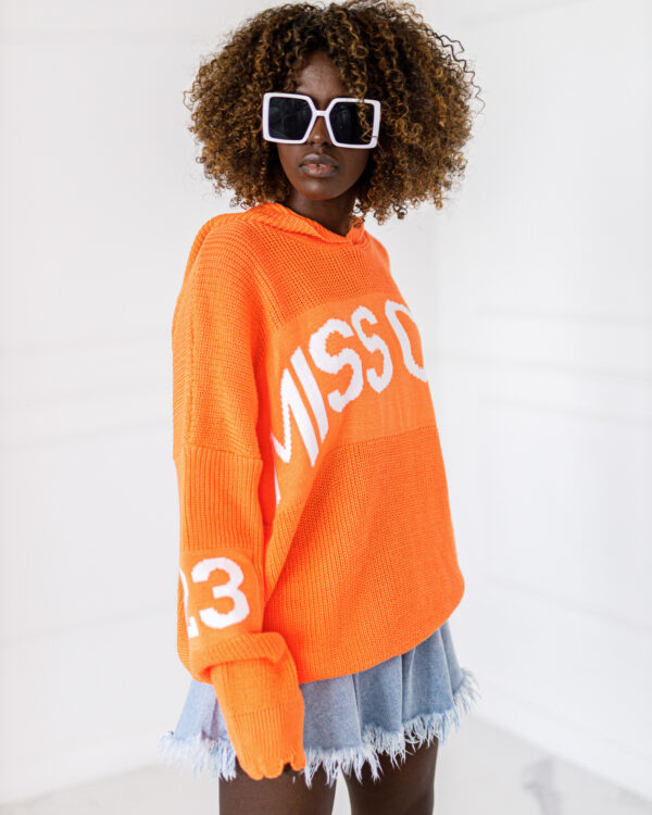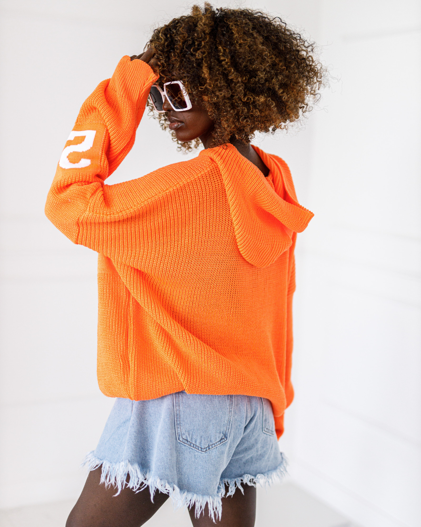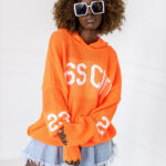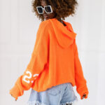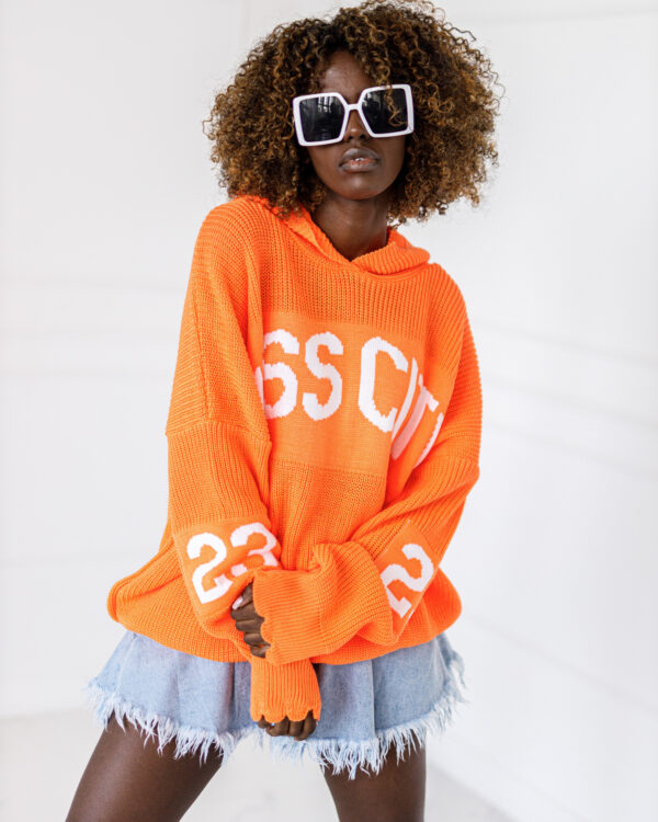 Modny i wygodny sweter w intensywnym pomarańczowym kolorze, z praktycznym kapturem i oznaczeniem numer 23, który nadaje mu unikalnego charakteru. Ostatnia sztuka