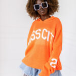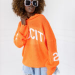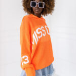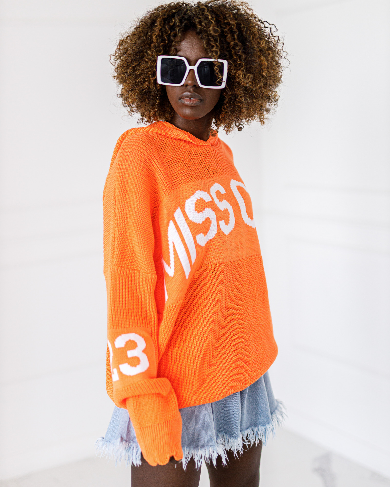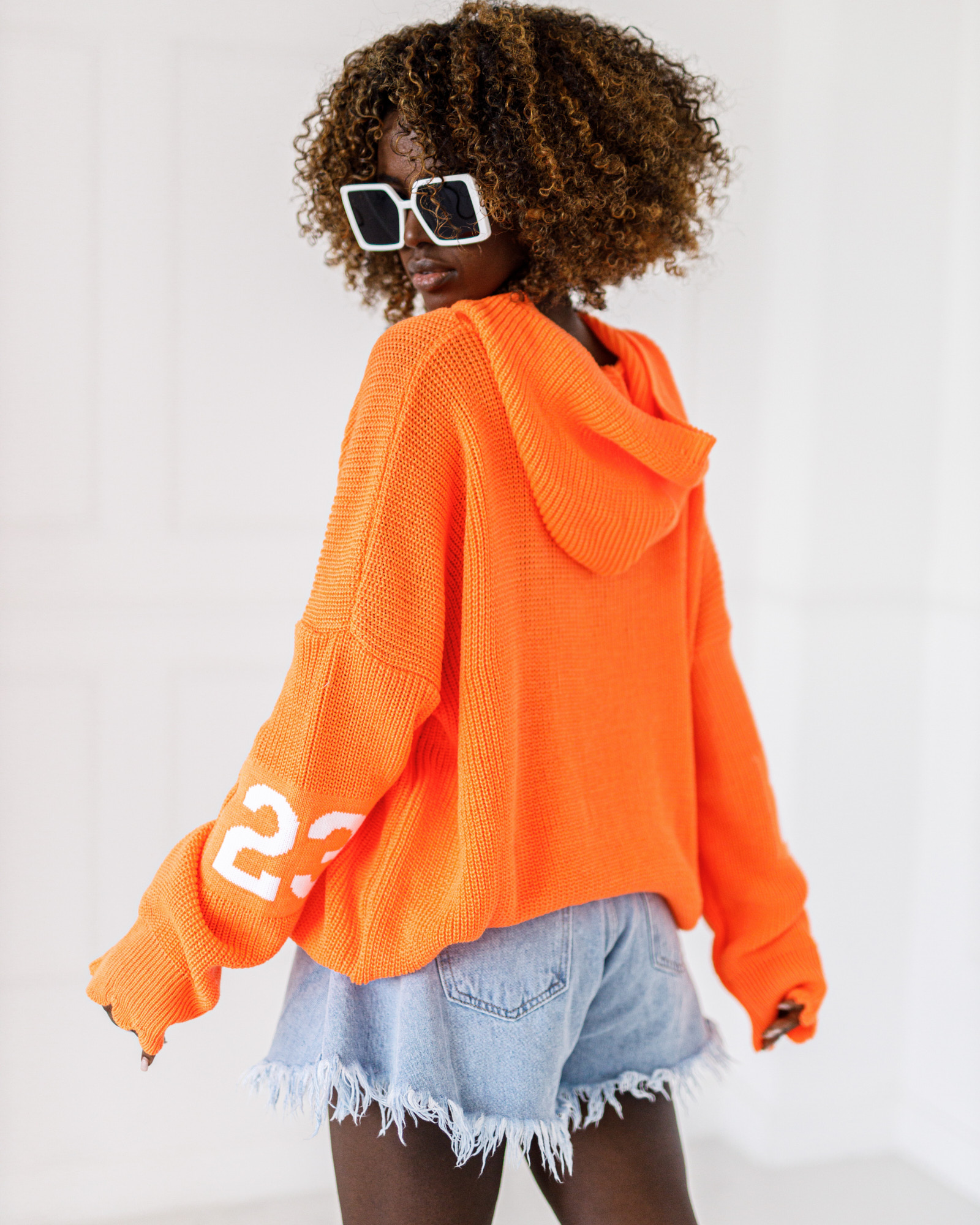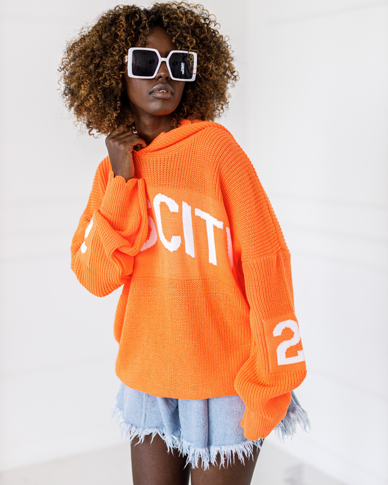 Modny i wygodny sweter w intensywnym pomarańczowym kolorze, z praktycznym kapturem i oznaczeniem numer 23, który nadaje mu unikalnego charakteru. Ostatnia sztuka