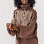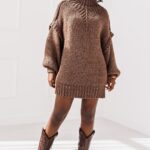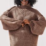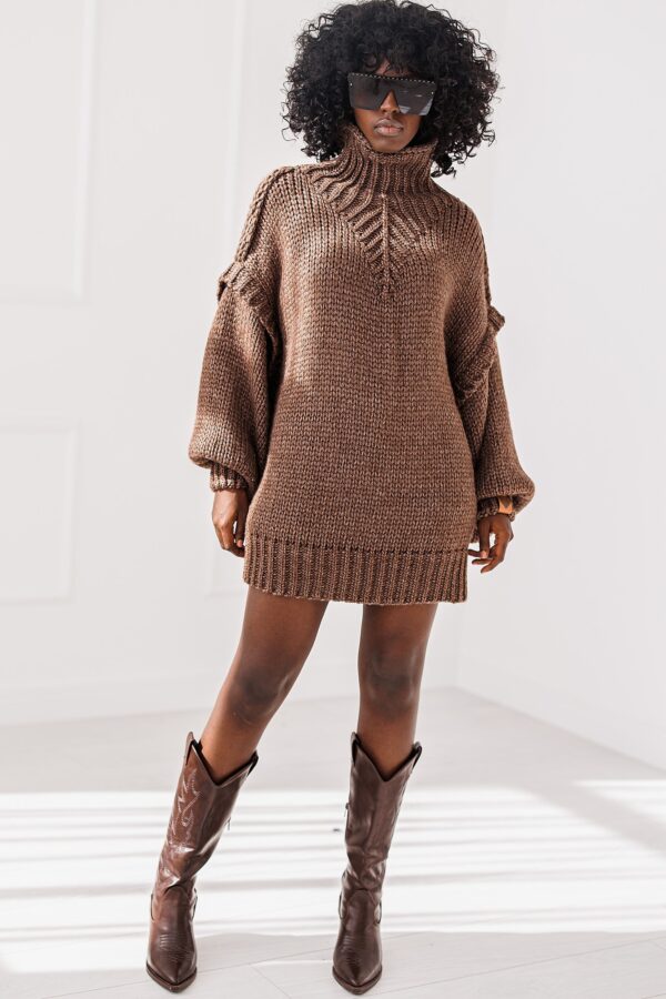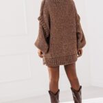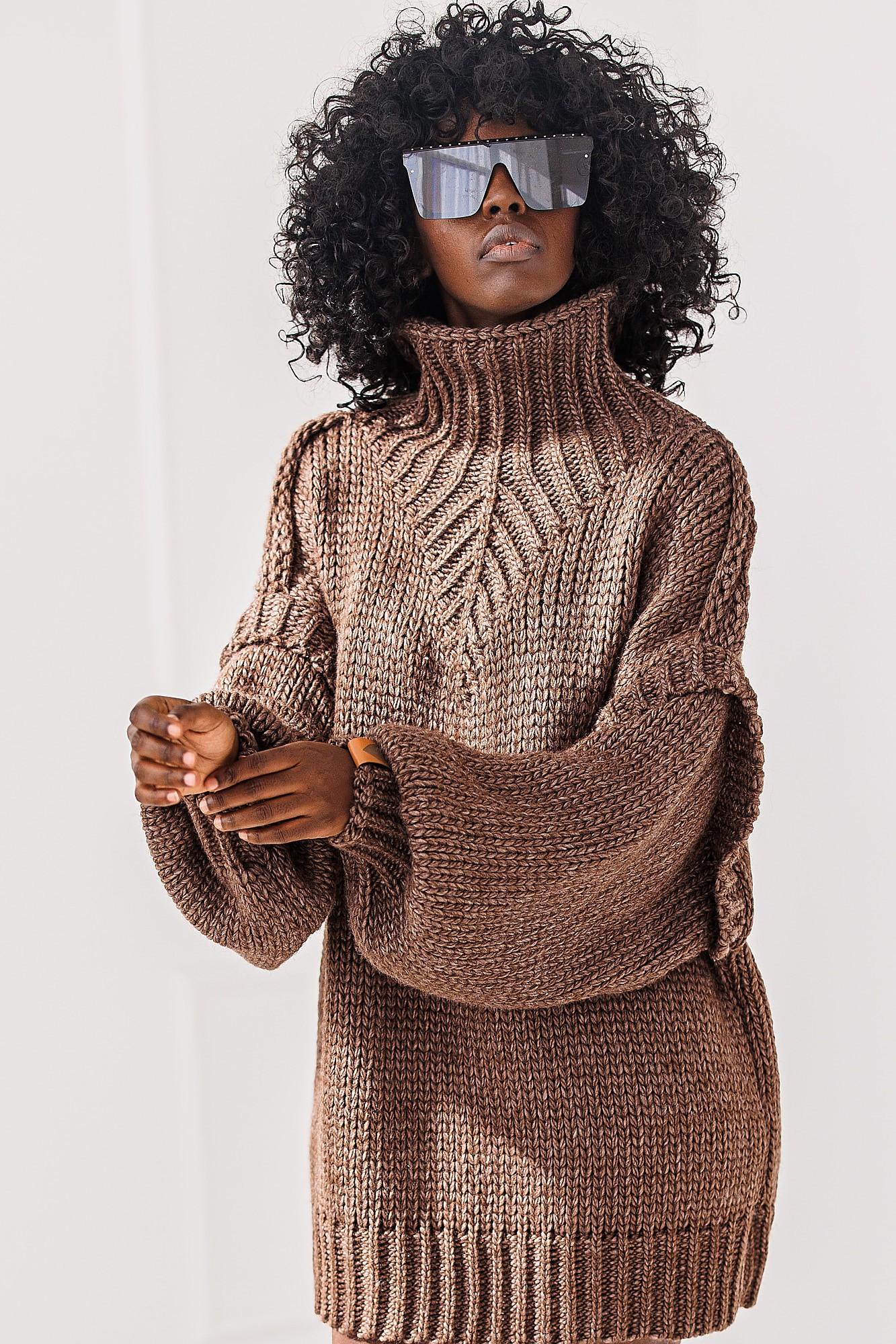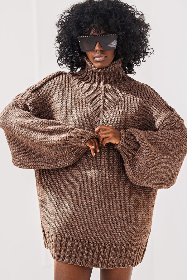 Brązowy sweter Noelle, styl, wygoda i ciepło w jednym. Charakterystyczny luźny krój i obszerne rękawy nadają mu modny, nowoczesny wygląd, a wydłużony fason pozwala nosić go zarówno jako sweter, jak i swetrową sukienkę.