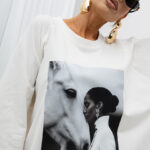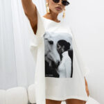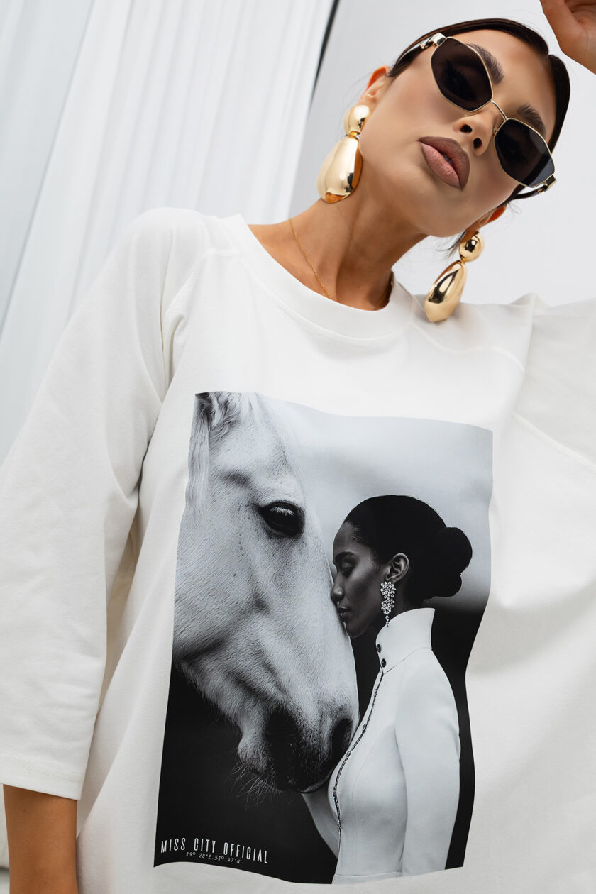 Damski t-shirt oversize Urban Focus w białym kolorze z artystycznym nadrukiem miejskiego tłumu i wyróżnioną postacią. Modny fason, wysoka jakość i polska produkcja. Idealny do casualowych i streetwearowych stylizacji.