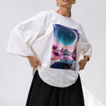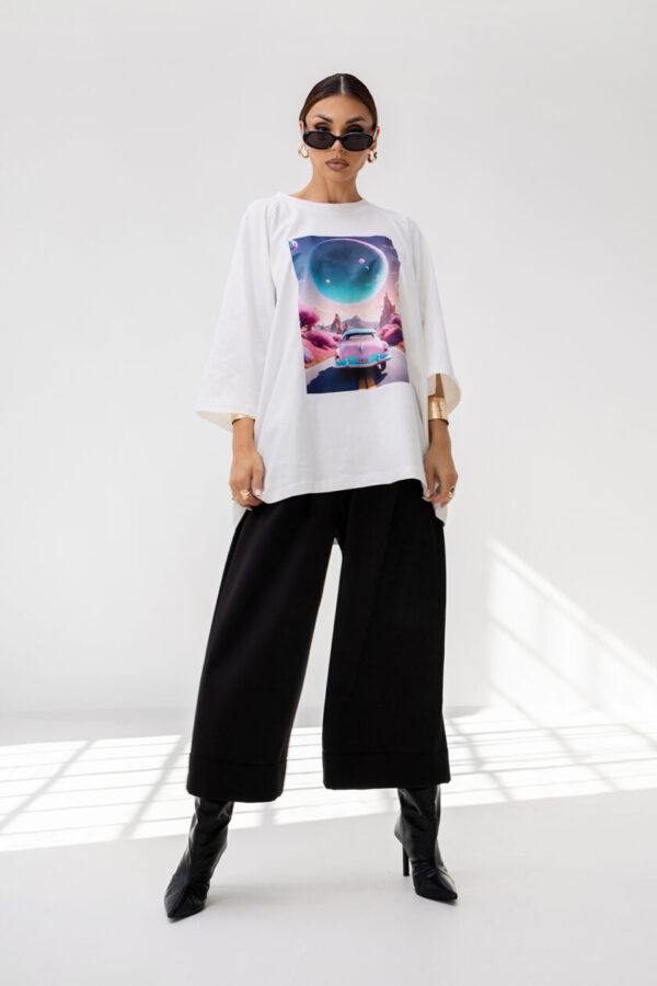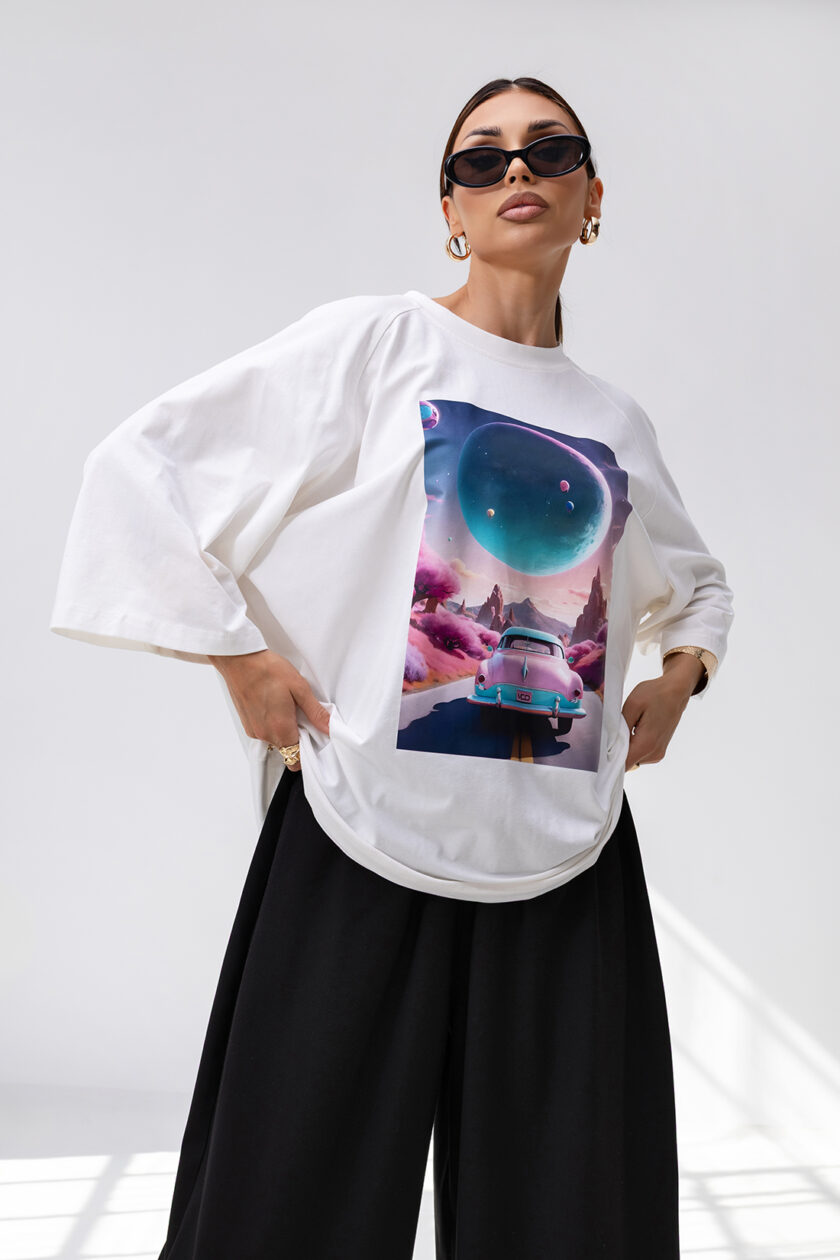 T-shirt o pudełkowym kroju ma luźną, oversize’ową formę z przedłużonymi rękawkami do łokcia, co nadaje mu nowoczesny, sportowy wygląd. Duży nadruk na przodzie, stanowi główny element przyciągający uwagę. Jest wygodny, casualowy i idealny do codzienn