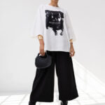 T-shirt o pudełkowym kroju ma luźną, oversize’ową formę z przedłużonymi rękawkami do łokcia, co nadaje mu nowoczesny, sportowy wygląd. Duży nadruk na przodzie, stanowi główny element przyciągający uwagę. Jest wygodny, casualowy i idealny do codzienn