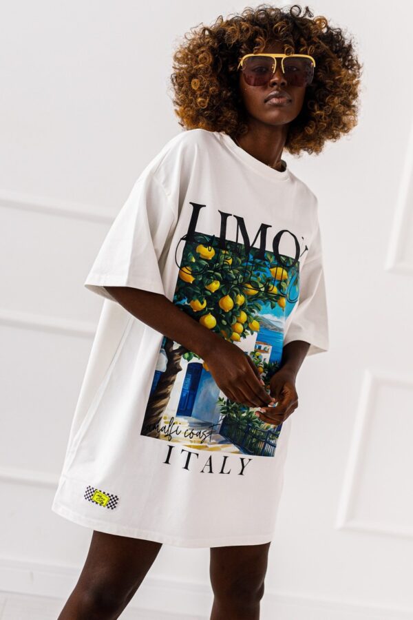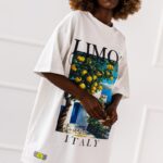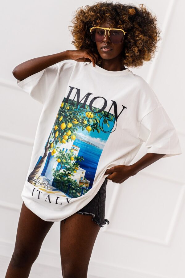 T – shirt to letnia pocztówka z Amalfi, nadrukowana na oversizowym t – shirce. Wzór który pachnie wakacjami