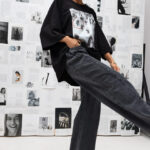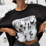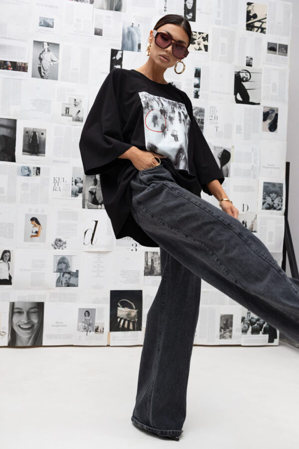 Damski t-shirt oversize Urban Focus w czarnym kolorze z artystycznym nadrukiem miejskiego tłumu i wyróżnioną postacią. Modny fason, wysoka jakość i polska produkcja. Idealny do casualowych i streetwearowych stylizacji.